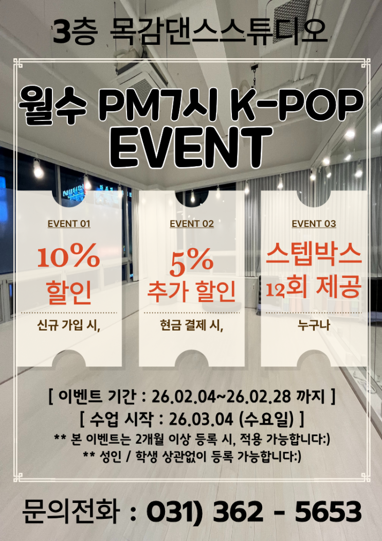 #목감댄스학원 #목감스텝박스수업 #시흥댄스학원 #시흥스텝박스수업 스트릿댄스 / 방송댄스 / 키즈반 / 스텝박스 / 필라테스 3월 4일 첫 수업 시작합니다! 안녕하세요, 목감댄스스튜디오입니다:) 많은 분들이 관심 가져주시고 문의 주셔서 월수 저녁 7시 k-pop 클래스 이벤트 기간이 연장되었습니다! 그리고 3월 4일(수)부터 새로운 수업이 첫 시작됩니다✨ 새롭게 시작하는 타이밍이라 처음 배우시는 분들도 부담 없이 시작하기 좋은 시기입니다! 이런 분들께 추천드려요 ✔ k-pop 댄스를 처음 배워보고 싶은 분 ✔ 취미와 운동을 함께 시작하고 싶은 분 ✔ 다이어트 목적의 운동을 찾고 있는 분 ✔ 청소년 / 성인 모두 가능 수업은 동....... <img src="https://blogthumb.pstatic.net/MjAyNjAyMjFfMjEg/MDAxNzcxNjMzMTg5NDY5.rWKanh2Pm9nFRyxFS04F-HMlOmGmxmcMd4kcBP3efgQg.y4Dz9Uv0st8fMFMDMCeDyxppbkzmqty_DXEjABhukksg.PNG/KakaoTalk_20260219_205452865.png?type=s3" />