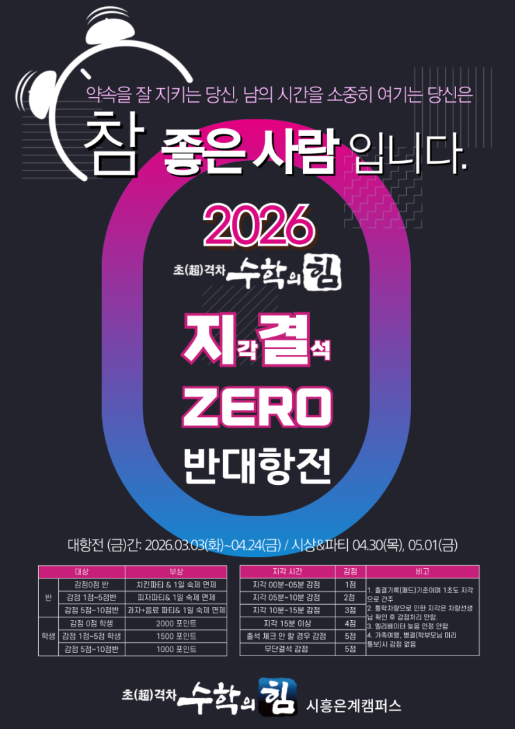 안녕하세요, 수학의힘 시흥은계캠퍼스입니다. 오늘은 아이들의 학습 태도와 생활 습관을 함께 성장시키기 위해 준비한 **‘지각·결석 ZERO 반대항전 프로젝트(지각·결석 예방 챌린지)’**를 학부모님께 자세히 안내드리고자 합니다. 단순한 출석 이벤트가 아니라, 아이들이 스스로 시간을 관리하고 책임감을 배우는 교육 프로그램이라는 점을 먼저 말씀드리고 싶습니다. 왜 ‘무지각·무결석’인가요? 아이들의 실력은 어느 날 갑자기 만들어지지 않습니다. 꾸준히 자리에 앉는 힘, 약속한 시간에 도착하는 태도, 빠지지 않고 이어가는 흐름이 쌓일 때 비로소 학습의 깊이가 만들어집니다. 지각과 결석은 단순히 한 번의 수업을 놓치는 문제....... <img src="https://blogthumb.pstatic.net/MjAyNjAyMjJfMjUx/MDAxNzcxNzY5ODc3ODUx.8YkKfFO5YMHLiFS1X_GbvN-GW4AUJBAz6nifVuPi6ukg.HJnPpEV8qGJIcOnPqfY6Dl3n8GrhO_sRYTzigb7lxY0g.PNG/%C1%A6%B8%F1%C0%BB-%C0%D4%B7%C2%C7%D8%C1%D6%BC%BC%BF%E4_-003_%289%29.png?type=s3" />