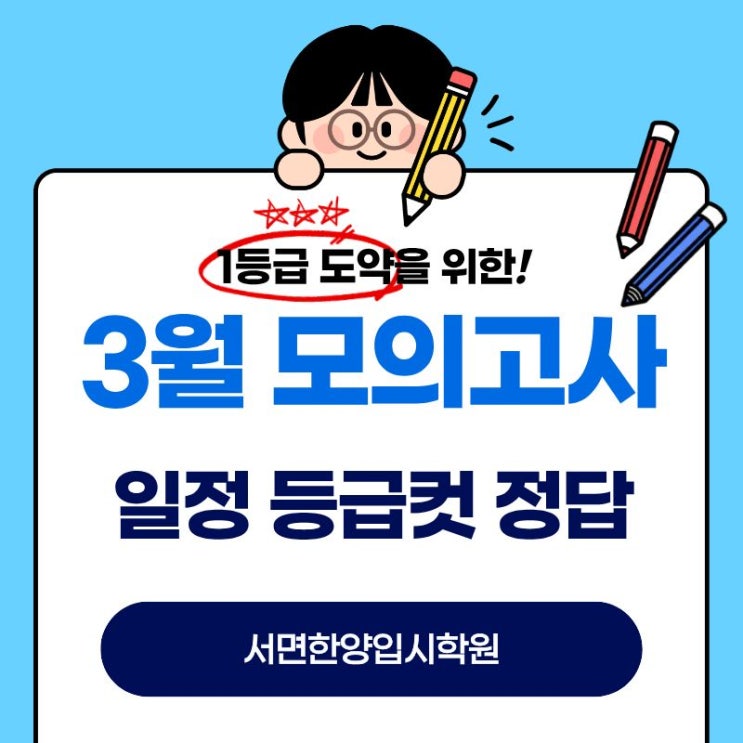 2026년 3월 모의고사가 다음주 시행됩니다 3월 모의고사는 올해 첫 전국 단위 모의고사로 현재 자신의 실력을 객관적으로 점검 할 수 있는 중요한 시험입니다 특히 고3 수험생에게는 이번해 수능을 대비하는 출발점이 되는 만큼 많이들 준비하고 계시리라 생각됩니다 오늘 블로그에서는 3월 모의고사 일정, 등급컷 (작년 기준) 그리고 이번 모의고사가 끝난후 정답 및 해설 확인 방법까지 포스팅에서 안내드리겠습니다 시험일은 2026년 3월 24일 (화)입니다 이번 3월 모의고사는 서울특별시교육청 주관으로 전국 고1,고2,고3 학생이 모두 시행합니다 작년 3월 모의고사 등급컷 (고3) 3월 모의고사 정답은 시험 당일 오후에 공개 될 예정입니다 아....... <img src="https://blogthumb.pstatic.net/MjAyNjAzMjBfMjQz/MDAxNzczOTk3ODAwODE5.xJWB7vwn4MxgiNofwfz0XPLHV0YUfJAEEFyn9eybXQcg.p20Qhc7TReCpoj9NYQNN010eAxiwMNZjA-OzQezUYugg.JPEG/0320.jpg?type=s3" />