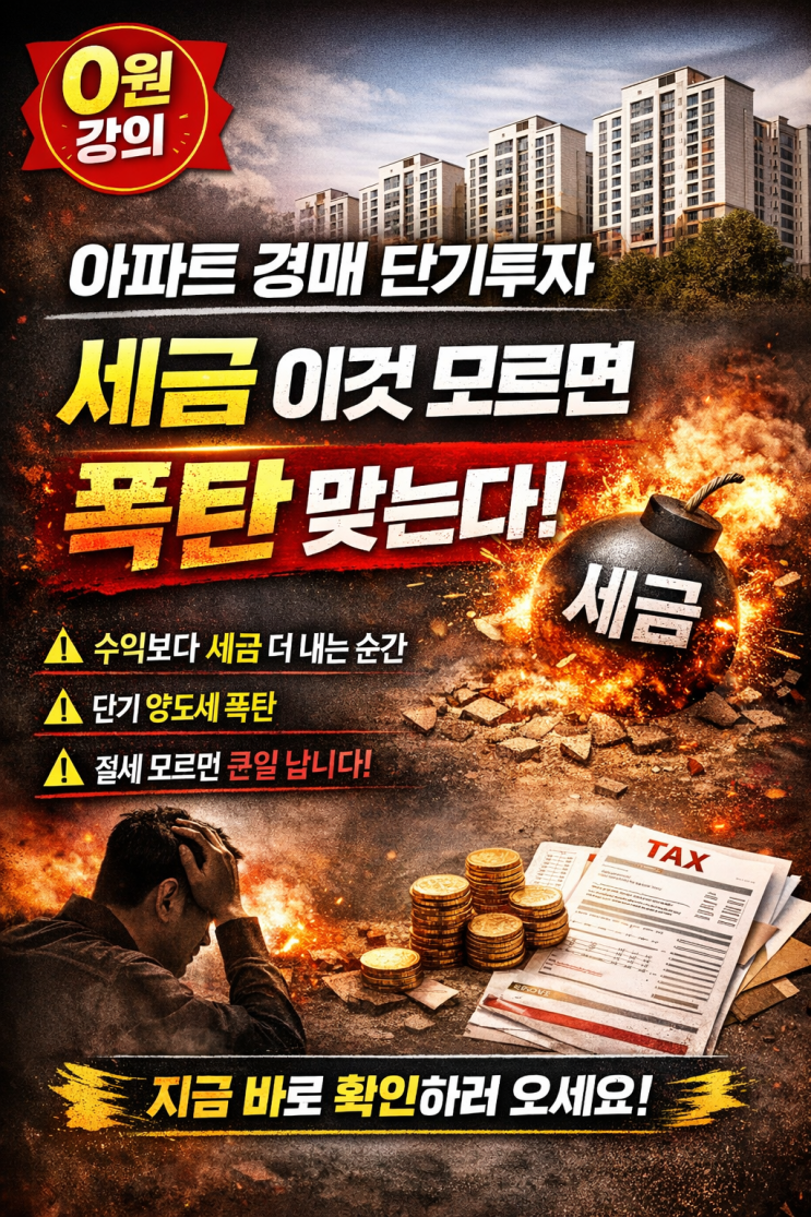 아파트 경매 단기투자는 소액으로 시작해 종자금을 빠르게 불릴 수 있는 강력한 방법입니다. 특히 아파트는 수요가 많고 거래 속도가 빠르기 때문에 단기 투자에 가장 적합한 자산입니다. 하지만 여기서 많은 분들이 넘어갑니다. 세금 때문에 수익이 사라지는 현실 낙찰 성공, 매도 완료, 수익 발생. 그런데 정산 후 남은 돈이 생각보다 적습니다. 왜 그럴까요? 단기 양도세 부담이 생각보다 크다 매매사업자 구조를 잘못 선택했다 필요경비 일부 불인정 절세라고 믿었던 방법이 오히려 독이 됨 실제로 많은 투자자가 세금 폭탄 한 번에 수익이 날아가고 다음 투자도 할 수 없는 상황에 처합니다. 세금 구조를 모르면 망할 수 있습니다 아파트 경....... <img src="https://blogthumb.pstatic.net/MjAyNjAyMTNfMjg2/MDAxNzcwOTQxMzY5NjIz.DjNpcU7y97Oz3y8M9FwvYM3Hd8xT6dHnIcfcgvxFUZYg.xe_K4Ruqlou8IgVtN9KArg4yHAcgG6CZxZPnuY1Y7ZUg.PNG/ChatGPT_Image_2026%B3%E2_2%BF%F9_13%C0%CF_%BF%C0%C0%FC_09_08_55.png?type=s3" />
