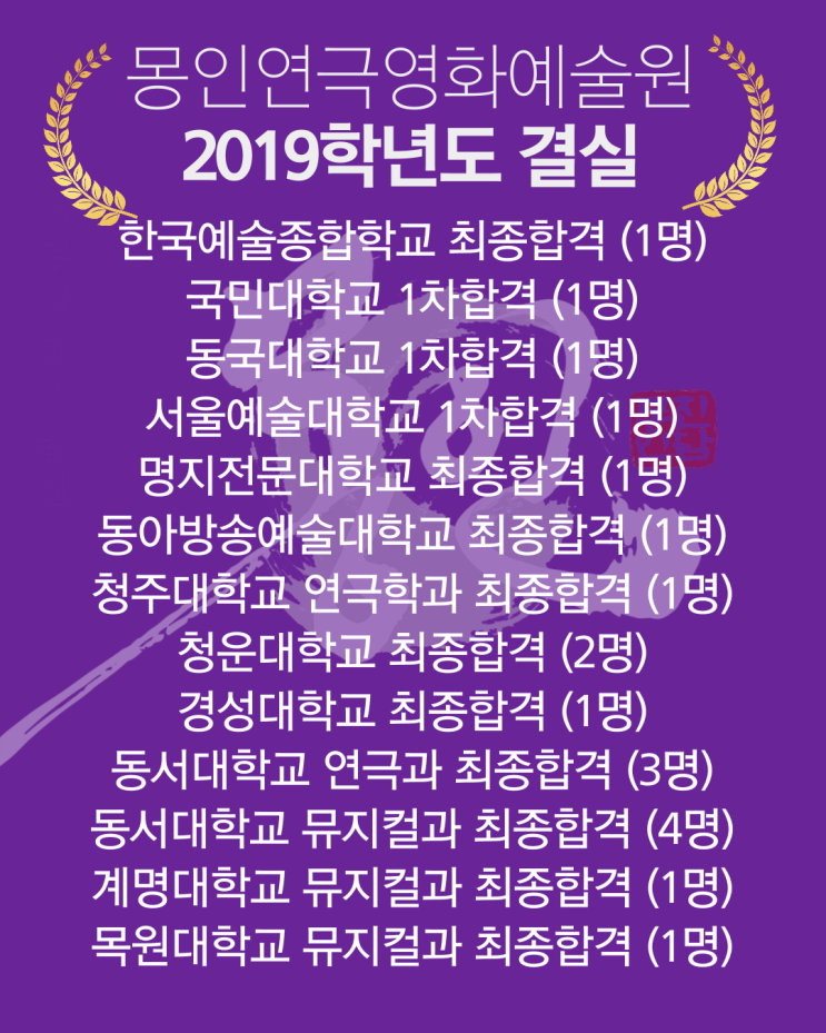 몽인연극영화예술원 2019학년도 입시 결과 한 해 동안 땀으로 버텨낸 시간, 포기하지 않고 끝까지 걸어낸 아이들의 결과입니다. 결과는 숫자이지만, 그 안에는 수많은 눈물과 성장의 시간이 담겨 있습니다. 2019학년도 합격 현황 ✔ 한국예술종합학교 최종합격 (1명) ✔ 국민대학교 1차합격 (1명) ✔ 동국대학교 1차합격 (1명) ✔ 서울예술대학교 1차합격 (1명) ✔ 명지전문대학교 최종합격 (1명) ✔ 동아방송예술대학교 최종합격 (1명) ✔ 청주대학교 연극학과 최종합격 (1명) ✔ 청운대학교 최종합격 (2명) ✔ 경성대학교 최종합격 (1명) ✔ 동서대학교 연극과 최종합격 (3명) ✔ 동서대학교 뮤지컬과 최종합격 (4명) ✔ 계명대학교....... <img src="https://blogthumb.pstatic.net/MjAyNjAyMDZfMTQy/MDAxNzcwMzUwODk1NDI0.TXI9U-dBw-pIECBkFlOBUzr5_DykbS_G41sym5ynLc8g.lf5xyleTWgXybkSGI--6xf3j5IXXx3eJiI5ENJzw0VYg.PNG/image.png?type=s3" />