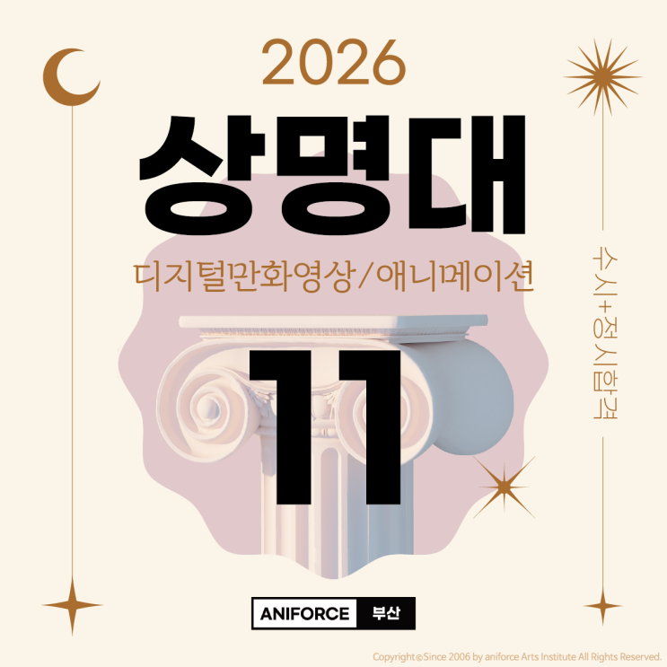 부산 대표 만화학원 부산 애니포스에서 <상명대 디지털만화영상/애니메이션과> 합격 소식을 전합니다. 2026년 상명대 11명 합격 상명대 디지털만화영상과는 칸만화를 전공하는 학생들에게 한예종 애니과와 함께 늘 로망처럼 이야기되는 학교입니다. 전국에서 칸만화를 가장 잘 그리는 학생들만이 합격할 수 있는 전형이기 때문에 상명대 디지털만화학과 합격자 명단은 그 만화학원의 칸만화 실기력을 증명하는 아주 중요한 기준이 되죠 2026년 부산 지역에서 칸만화 전형으로 상명대 합격자를 배출한 만화학원은 현재 부산 애니포스가 유일해요 그리고 하나 더 저희에게 정말 자랑스러운 결과 상명대 합격 전국만화학원 1위 부산 애니포스....... <img src="https://blogthumb.pstatic.net/MjAyNjAyMDdfMTgg/MDAxNzcwNDM3NDgzMDg5.UNi00kC-0nkhMXH0x7a7xs-g9Qr1NStA1PpSf3yddREg.KGMzyNetR-ZE-E6d48vYX5OnDEZOyNNl6LGrc7yr7RAg.PNG/2026_%C7%D5%B0%DD%C0%DA_%BD%E6%B3%D7%C0%CF_%BC%F6%BD%C3%2B%C1%A4%BD%C3%C7%D5%B0%DD%28%BB%F3%B8%ED%B4%EB%29.png?type=s3" />