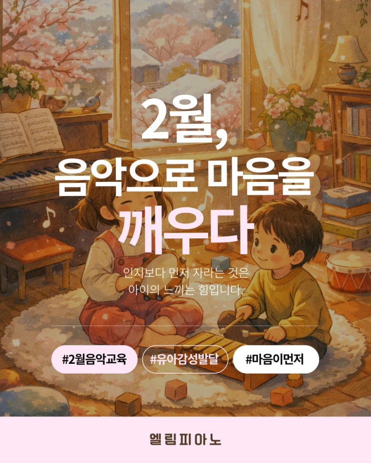 2월, 아이에게 가장 먼저 필요한 발달은 무엇일까요? 많은 부모님들이 이렇게 질문하십니다. "아직 어려서 뭘 가르쳐야 할지 모르겠어요." "공부는 언제부터 시작해야 할까요?" 하지만 유아기의 발달을 조금만 들여다보면 질문은 자연스럽게 바뀝니다. '무엇을 가르칠까'가 아니라 ✅️ '무엇이 먼저 자라야 할까'로요. 아이의 발달은 인지보다 '감성'이 먼저 움직입니다. 말을 완벽히 이해하지 못해도 아이들은 소리의 높낮이에 반응하고, 리듬에 몸을 흔들고, 분위기와 감정을 그대로 느낍니다. 이 시기의 아이에게 음악은 배워야 할 과목이 아니라 '세상을 처음 만나는 방식'입....... <img src="https://blogthumb.pstatic.net/MjAyNjAyMDJfNTcg/MDAxNzcwMDAxMjcwNTM3.kAYabih7PobJdIYO2i2KfGda_sjg0WCzG2HNAKh6eywg._P4K35LEsPf7Y-MztqSU1kkkm3zqX29g9yNkMJuk29cg.JPEG/output%A3%DF1509668592.jpg?type=s3" />