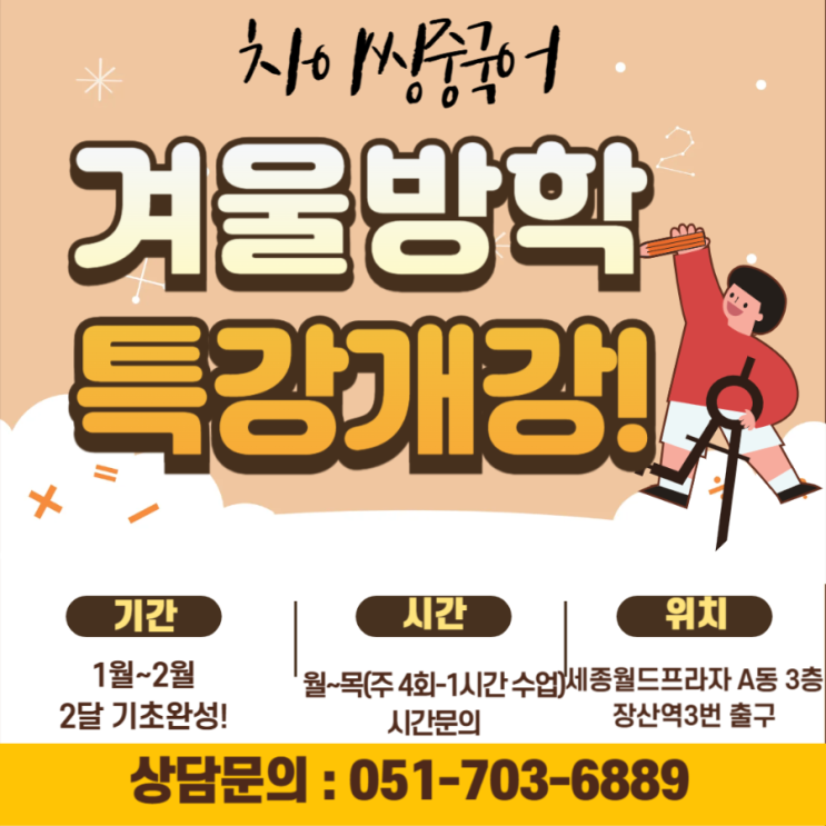 大家好! 안녕하세요 여러분~~~ 2025년이 거의 끝나가네요 올 한해는 정말 순식간에 지나간거 같아요^^다들 만족하는 한해였나요? 지나간 날들은 지나가고 우리는 또 새로운 한 해인 2026년을 맞이할 준비를 해야겠죠? 어떻게요???? #중국어공부 하면서요 하하하 저희 #중국어방학특강반 시작합니다~~~ 4~5달 과정을 2달!!만에 끝낼수있는 철호의 기회!! 중국어 1도 어렵지 않으니 #차이씽중국어전문어학원 으로 오세요~~~~ 특강반 조기등록시 무려~~~ 8%할인도 들어갑니다. 기회를 놓치지 마세용 저희 #HSK대비반도 개강합니다!! 남들과 다른 스펙 만들어야겠죠?? 중국이 엄청난 속도로 발전하고있습니다. 미리미리....... <img src="https://blogthumb.pstatic.net/MjAyNTEyMTdfMjU4/MDAxNzY1OTc2MDU4NTM4.usIQsxXMDWN1Bua894fMPCemj0S5rLNEmTQu_Z8Nf0sg.ysWJtCIxJv6b71-iy9dZyNb9yejnWMj1k92htQkoZGkg.PNG/900%A3%DF1765966853576.png?type=s3" />