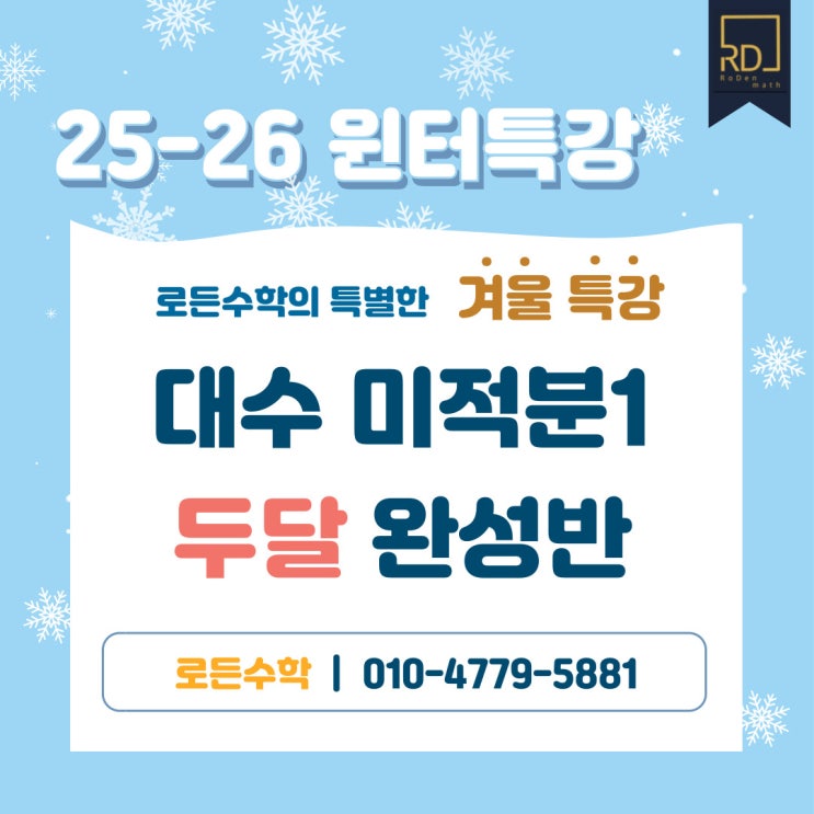 로든수학학원 25-26 윈터스쿨 대수 미적분1 두달만에 완성하기!! ■ 대상 · 공1, 공2 선행이 된 학생 ■ 기간 : 26년 1월 초~2월 말 (과목당 24회) ■ 요일 · 대수 : 월/수/금 11시 반~2시 반 · 미적분1 : 화/목 11시 반~2시 반 토 2시~5시 ■목표 : 개념서, 유형서 정답률 80%이상 주요 컨텐츠 1. 개념 강의 2. 매일 개념 Test 3. 오늘 수업한 내용과 숙제 Daily Test 4. Weekly Test 5. 공1, 공2 약한부분 개인보완 6. 수능문제 맛보기 (4점~준킬러) 특강은 학원에 오래 있어야 하지만, 친구들과 함께 진행하기 때문에 의지가 조금 부족하더라도 끝까지 해낼 수 있습니다! 고등수학은 시간이 정말 많이 필요하기 때문에 겨울방학부터 공부습관....... <img src="https://blogthumb.pstatic.net/MjAyNTEyMjZfMTcg/MDAxNzY2NzM5MTYzMzcw.4ixRY5Op9VABVXP4qhIygh9KEUkTQME2AHAbzNJZIzQg.gQOSKtGpS5CFWycN-p32-W-IY8RqW8dN44qwuDLUPVAg.JPEG/001.jpg?type=s3" />