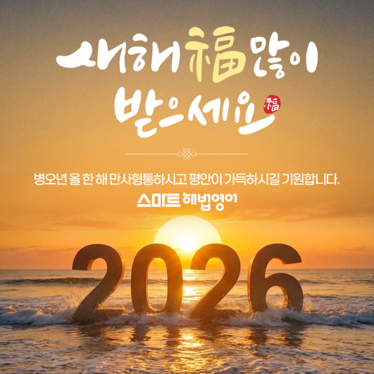 2026년 새해 인사드립니다 안녕하세요. 스마트해법영어 금정교실 입니다~^^ 희망찬 2026년 새해가 밝았습니다. 지난 한 해 동안 저희 학원을 믿고 함께해 주신 학생들과 학부모님들께 진심으로 감사의 인사를 전합니다. 매일 교실에서 아이들이 영어를 하나씩 익혀 가는 모습, 처음엔 떨리던 목소리가 점점 자신감 있게 변해 가는 순간들을 지켜보며 저 역시 큰 보람과 책임감을 느낀 한 해였습니다. 2026년은 배움의 과정이 더욱 단단해지는 해가 되기를 바랍니다. 영어는 단기간에 완성되는 과목이 아니라, 꾸준함과 올바른 방향이 무엇보다 중요한 과목입니다. 저희 학원은 새해에도 단어 학습을 기본으로, 읽기·쓰기·말하기가 균형 있게 성장....... <img src="https://blogthumb.pstatic.net/MjAyNjAxMDJfMTA3/MDAxNzY3Mjc5OTExNDc2.klTRv-GOy66xJgJCzQT-stFXd3DwLVecI12ts1bWUqUg.Vr885vIV3RxLyxN8WYM4Z0JefcUYyG0G17onc4kjGP8g.PNG/900%A3%DF%A3%DB%B0%F8%C5%EB%C5%DB%C7%C3%B8%B4%A3%DD2026%BA%B4%BF%C0%B3%E2%A3%DF%BD%C5%B3%E2%C0%CE%BB%E7%A3%DFC%BE%C8%BF%B5%BE%EE%A3%DF%BD%BA%C6%BF%B9%F6%C0%FC.png?type=s3" />