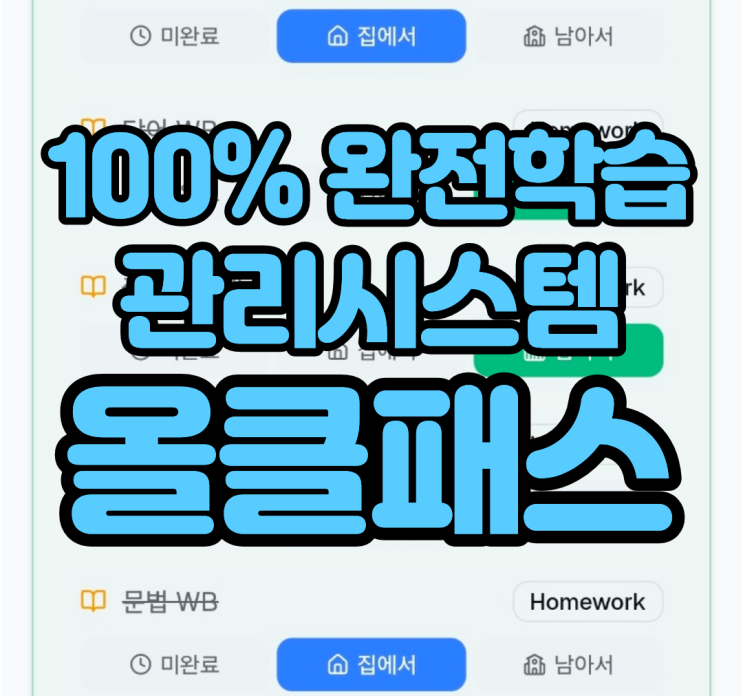 안녕하세요? 부산 금정구 장전동 영어학원 영어쑥쑥어학원입니다. 우리 영어쑥쑥 중고등부에 2026년부터 새로 도입된 시스템이 있습니다. 바로 '중고등 과제관리 시스템 올클패스' 입니다. 먼저, 왜 이런 시스템을 만들게 되었는지를 살펴보려면 영어쑥쑥 중고등부가 어떻게 공부하는지를 알아야 하는데요... 우리 중고등부는 담임선생님이 진행하시는 문법/리딩이 메인입니다. 학년벨 레벨별로 반별로 같이 진도를 나가면서 이해도를 점검하기 위해서 Daily Test를 치고 있습니다. 또한, 단어와 리스닝은 개별진도로 미디어실에서 따로 학습을 진행하고 있습니다. 그러다보니 테스트 결과관리, 단어/리스닝 개별진도 관리 등... 수업....... <img src="https://blogthumb.pstatic.net/MjAyNjAxMDdfMjkw/MDAxNzY3NzY2OTk4Mzg0.p3YAJBtzeO_0zfP3dk_NFIAE4UoMijHYsGNsAIkr7SEg.xPFeCa3VmHiz7TY-DeCcdSqlPLNWZU1xaF1-ZRQyv04g.PNG/%C1%A6%B8%F1%C0%BB_%C0%D4%B7%C2%C7%D8%C1%D6%BC%BC%BF%E4._%2813%29.png?type=s3" />