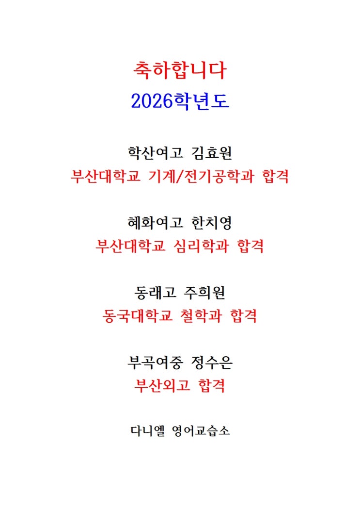 [연제구 영어학원]EDU 2026년 1월 Monthly Test 우수생 발표