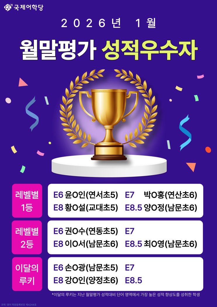 안녕하세요. 국제어학당 본원입니다. 국제어학당 본원의 초등 EDU 12월 월말평가 성적 우수자를 발표합니다. 국제어학당 본원의 초등 EDU는 매번 직전 수업 진도에 따른 학습내용을 점검하게 해주는 Daily Test와 월별 진도를 복습하도록 해주는 월별 Monthly Test로 학생들의 학습을 평가하고 있습니다. 월말 시험 성적우수 학생들에게는 '에듀코인' 적립과 함께 선생님과 친구들의 칭찬의 박수를 함께 전하였습니다. 가정에서도 학부모님의 많은 칭찬과 격려도 부탁드립니다. "오직 국제어학당 본원만이 가능한" 독보적인 학습관리 시스템 "완공 CLASS" 학원등록번호 : 제 4244호 [교습비] 초등(DreamKids-Howdy....... <img src="https://blogthumb.pstatic.net/MjAyNjAyMjBfMjE4/MDAxNzcxNTcyNzk0MzAy.cWlIP5NudWlg5oqb6jX9oXJHwkymmU07l_tSVD4gkkMg.TjkwhtecRm01qgf9tKwtyRA_Z6SQ-EeyzONzIiFeBDQg.JPEG/E%B7%B9%BA%A7-%BF%F9%B8%BB%C6%F2%B0%A1-%BC%BA%C0%FB%BF%EC%BC%F6%C0%DA-004.jpg?type=s3" />