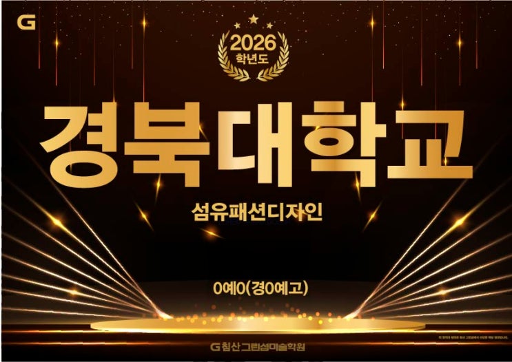 2026학년도 경북대학교 정시전형 합격자입니다. 경북대 수시전형에 이어 정시전형에서도 합격입니다. 수시전형에서는 디자인학부10명 정원 중 2명이 저희 학원에서 합격생이 나왔는데요 수시는 경쟁률이 20:1을 넘었었죠. 엄청난 결과입니다. 그리고 정시에서도 1명 지원 1명합격입니다. 합격을 진심으로 축하합니다. 경북대 정시 전형 합격자(위) 경북대 수시 전형 합격자(아래) 대구미술학원 대구북구미술학원 053.627.1005 가까운 곳에서 안전하게~ 지원자 비례 최고의 합격을 만나보세요^^ 2027학년도 입시반 모집중. 예비반(고2~고1) 모집중 예고 지원반 모집중. <img src="https://blogthumb.pstatic.net/MjAyNjAyMDNfMjk0/MDAxNzcwMTA4ODYxODAz.RWLtt5ytR5XDRzuF-PY_ijBxg5LoiJS4j4dHAgs_jLUg.0Na8scqhPdoAQDqtjG21_6NX-VolNSpM10sFHN64Y68g.JPEG/%B0%E6%BA%CF%B4%EB_%B5%F0%C0%DA%C0%CE1.jpg?type=s3" />