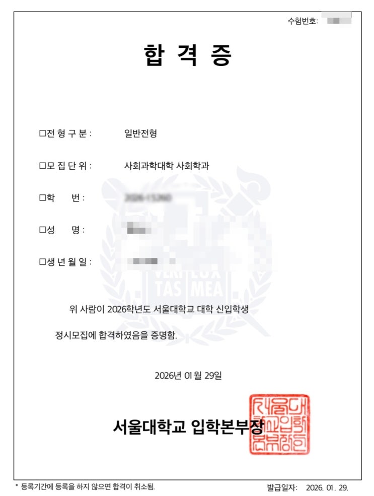 메카메틱스 수학학원 졸업생, 서울대 사회학과 합격 고3 S 원장님 직강반 고1~고2 A 부원장님반 수강생 메카메틱스 수학학원에서 두번째로 받아보는 서울대 입학증입니다. 합격을 축하합니다. 자습실에 제일 아침에 와서 제일 늦게까지 공부하고 가던 성실한 학생이었습니다. 고1~고2때 부원장님 강의를 들으며 기초를 다시고 복습 또 복습 고3 -6월 이후부터 원장님과 함께 최고난도 문제를 풀이! 수능성적표 미적분100점도 인증하겠습니다. 합격의 기쁨을 함께 합니다. 오늘 원장님, 부원장님과 술 한잔 하며 회포를 풀기로 하였습니다. 빛나는 청춘을 진심으로 응원합니다. <img src="https://blogthumb.pstatic.net/MjAyNjAyMDVfMTI2/MDAxNzcwMjc0MjU3NTcx.rBECSTMWsJW5D98IfGYkqUCJMLk62WLh4HByLdsDRfUg.S7r97q-t7ci9FgqISzXac4vAFeybCySfYY5ivXr-uu0g.JPEG/%BC%AD%BF%EF%B4%EB%BB%E7%C8%B8.jpg?type=s3" />