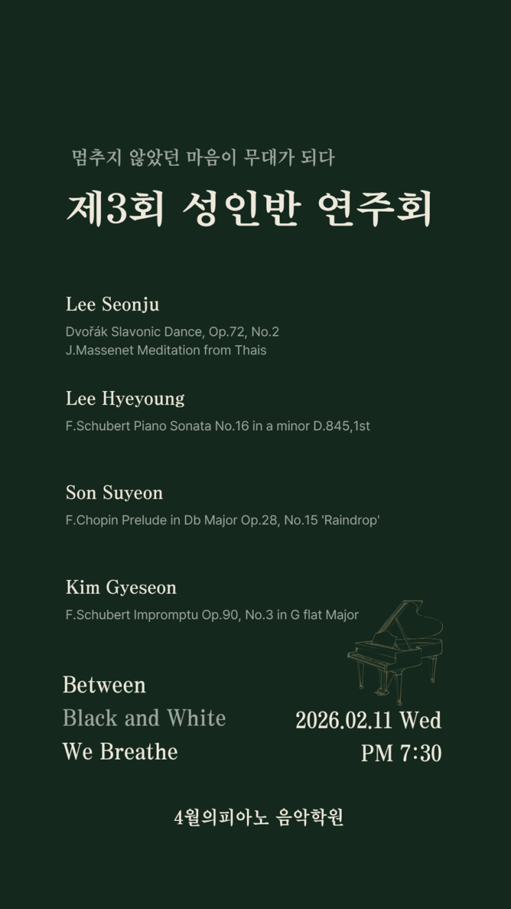 안녕하세요, 4월의피아노 음악학원입니다. 올해도 저희 성인반이 작은 연주회를 엽니다. 바쁜 일상 속에서도 조금씩, 천천히 피아노 앞에 앉아온 시간들이 이날 하나의 연주가 됩니다. 잘하려고가 아니라 조용히 쌓아온 시간으로 용기 내어 무대에 오르는 날이에요. 편안한 마음으로 따뜻하게 들어주시면 좋겠습니다. 진심이 담긴 연주들, 함께해 주세요 멈추지 않았던 마음이 무대가 되다 #4월의피아노 #사월초피아노학원 #시지성인피아노학원 #사월동피아노 #사월초피아노 #매호초피아노 #정평초피아노 #사월동피아노학원 #시지피아노학원 #시지성인피아노 #대구성인피아노학원 #시지성인취미 #성인취미피아노 #시지성인첼로 #시지성인플....... <img src="https://blogthumb.pstatic.net/MjAyNjAyMTBfMTQg/MDAxNzcwNzAwNzE2MjA2.Tft-PhWafps8khIfwUfIyweun9Suo4LF5vKAmuSQ91og.Ha6NuZiQl0wv6hkruNYM5EbGlaiRPWiVtdtitQFn204g.PNG/%BF%AC%C1%D6%C8%B8%BC%F8%BC%AD_%A3%A81%A3%A9.PNG?type=s3" />