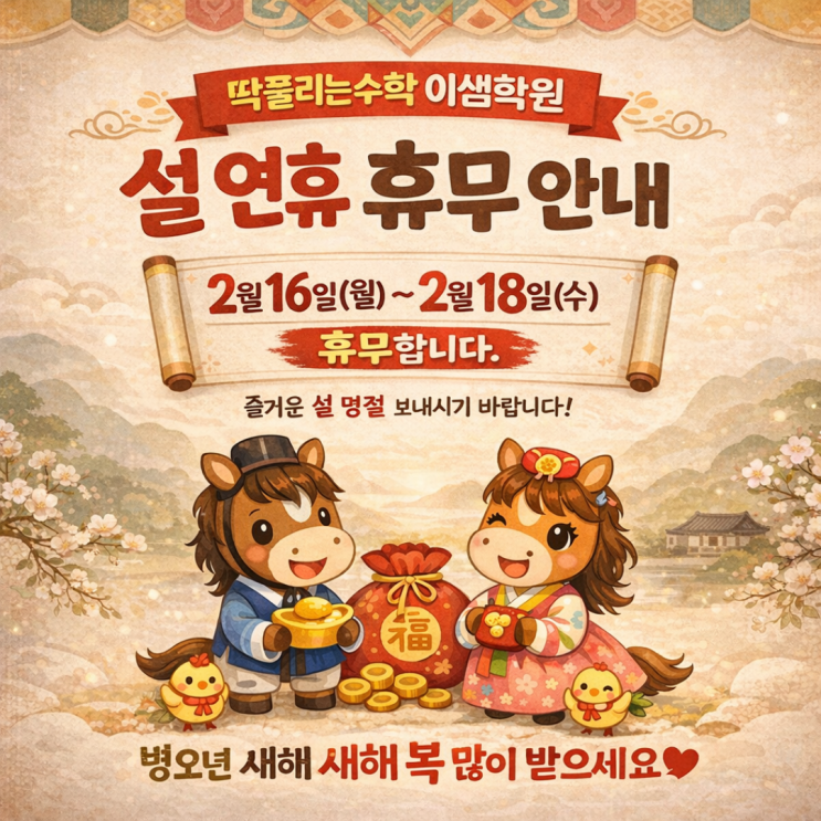 안녕하세요^^ 서창 이샘학원 딱풀리는수학 서창센타프라자점입니다. 다가오는 설 명절을 맞아 아래와 같이 설 연휴, 휴원 일정을 안내해 드리겠습니다. 설 연휴 휴원 기간 가족들과 건강하고 즐거운 명절 보내시고 새해 복 많이 받으세요~!! 2월 19일에는 정상수업합니다. 연휴 전후 수업은 정상 운영되고, 결석 및 보강 관련 사항은 개별 안내 드릴 예정입니다. 연휴 대비 기존 재원생은 방학기간 동안 조금씩 더 추가 수업으로 운영 중에 있었습니다. 최근 입회생이나 입회 예정인 학생은 개별적으로 안내해 드리겠습니다. 아이들과 함께 가족의 소중함을 느끼는 따뜻한 명절 보내시길 바라며, 연휴 후 더욱 즐겁고 알찬 수업으로 다시 만....... <img src="https://blogthumb.pstatic.net/MjAyNjAyMDlfMTYw/MDAxNzcwNjIxODgwMjU4.GZQKh_8A4b_zJ5Df3cnBqsgrMQgSYyFnKhZ8iWdXhNEg.6SPlTwzIZeAU5uCF1Ml_BYxdBA0ufm6rJtBDzHKl1ecg.PNG/%BC%B3%B3%AF%C8%DE%B9%AB-001.png?type=s3" />