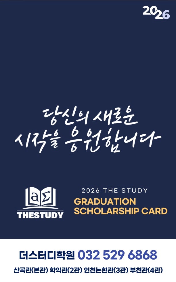 졸업과 입학이 맞물리는 이 시기, 저희 더스터디학원은 항상 졸업선물로 고민했었는데요 이번에는 새로우면서 특별한 졸업선물을 준비했습니다~ 단순한 선물을 넘어, 그동안의 노력을 인정해 주고 새로운 시작에 작은 보탬이 되고 싶은 저희의 진심을 담았습니다. 학사모 모양의 간식에 넣을 문구는 제가 고민고민하다가 ㅎㅎㅎ 정말 진심을 담아 썼습니다 너희들의 새 날들을 응원한단다!!! 당신의 새로운 시작을 응원합니다 카드에 담긴 이 문구처럼, 저희 더스터디학원은 아이들이 지난 시간 쌓아온 노력을 발판 삼아 새로운 학교에서도 멋지게 비상하길 바라는 마음을 담았습니다. 카드에 아이들 용돈 넣어주면서 엄마 마음으로 한장한장 나....... <img src="https://blogthumb.pstatic.net/MjAyNjAyMTBfMTI2/MDAxNzcwNzI0NDc0NDY2.hxEo3duaEJqmmjKDXpeA_IQWQJJDjDLSs-e6xLYu1mEg.GgNUvWJfJHt0Bl0bYMjXfhCApH-FkDw9wbxbjbA7i4cg.JPEG/KakaoTalk_20260210_204549879_03.jpg?type=s3" />