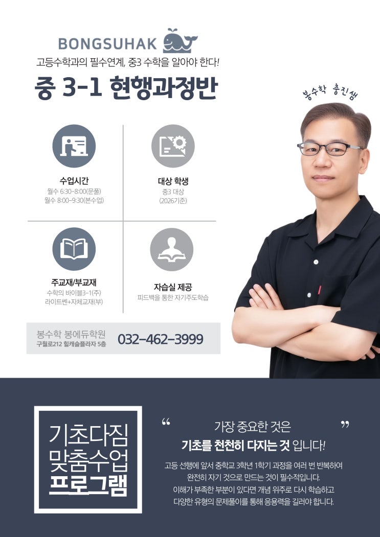 안녕하세요~ 구월동 수학학원계의 봉, 봉수학학원의 봉매지기 인사드려요~~ 중학교 수학의 마지막 기초를 완성하는 시기, 바로 중학교 3학년 1학기 수학입니다. 중1이 '수학의 문법'을 배우는 단계였다면, 중2는 그 문법을 활용해 관계를 이해하는 과정, 그리고 중3-1은 고등수학으로 넘어가기 전 사고력을 정리하고 완성하는 시기입니다. 우선 몇몇가지 설명에 앞서 3-1 수학단원부터 살펴볼까요. 1.제곱근과 실수 중학교에서 수의 세계가 확장되는 순간이에요. 아이들이 혼란스러워하는 이유는 계산이 아닌 개념 때문이랍니다. 2. 다항식의 곱셈과 인수분해 중3-1에서 가장 중요한 단원중의 하나에요. 고등수학 전 과정의 출발점이라....... <img src="https://blogthumb.pstatic.net/MjAyNjAyMTJfMTAz/MDAxNzcwODg4NjIzMTA1.HR-4EzE4M_FOL3FNsdzAk3kd0LDPxNfGtF0xqKHmsYMg.D-wHKKMOrVyvyGQMrjZ3e-JxjvzxRrPn6jMw9f8phqAg.JPEG/%C3%E6%C1%F8%BB%F9_3-1%282%29.jpg?type=s3" />