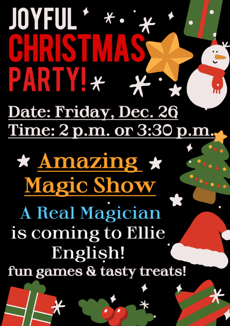 모두가 기대하는 Christmas Party!!! 이번엔 마술쑈로 준비!! 깜짝 놀랄 Elliers!!생각에ㅎㅎ 마술사분 초빙!!! 드디어~~Welcome^^ 내 옷 속에서~~나오다니!! 앗!!!이게 가능하다고! 많이 즐거워하는 모습을 보니~ 엘리원장님 뿌듯 ㅎㅎ 내년 크리스마스에도 기대해~~ <img src="https://blogthumb.pstatic.net/MjAyNjAyMTJfMTMy/MDAxNzcwODYzNTk5NjE5.w_KO_fqcFssxGOEZWjaPBCfLkykKAncnp1LnSSvBEY0g.diVckDGbUAQgvLwduKwXnz_RKZgWH9WN_pF4GfhgHUsg.PNG/1765863443143.png?type=s3" />