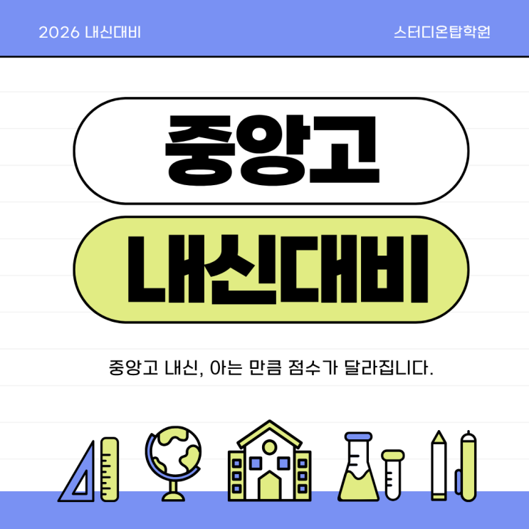 안녕하세요, 스터디온탑학원입니다. 중앙고 시험을 준비하는 학생·학부모님들께서 가장 많이 하시는 질문이 있습니다. “중앙고는 어떻게 대비해야 하나요?” 중앙고 내신은 교과서 + 학교 수업 자료 + 외부지문의 연결이 매우 중요한 학교입니다. 그래서 중앙고 출제 흐름에 맞춘 내신대비반을 개설했습니다. ✔ 중앙고, 이렇게 대비합니다 중앙고 시험의 핵심은 ‘그대로 암기’가 아닌 ‘변형 대비’입니다. 교과서 지문이 그대로 나오기보다는 → 표현·문장 구조·숫자·조건이 바뀐 형태로 출제 외부지문이 단독으로 출제되는 경우도 있음 서술형은 교과서 학습활동에서 직접 출제 따라서 교과서·학습지 중심 학습 + 외부지문 변형 연습....... <img src="https://blogthumb.pstatic.net/MjAyNjAyMTFfMjYw/MDAxNzcwODAyNjM1ODky.klSF_bEIH99198JXA-aTJ85fV9CCwYOeIzQ5uPvwvSwg.YKSE3Rkf2KlBWBrNcKc0nX8aNH--k_Gzqr9MPuEr6gog.PNG/1.png?type=s3" />