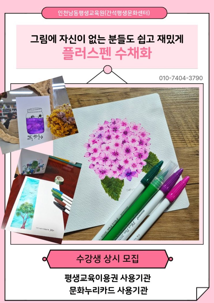 그림에 자신이 없는 분들도 쉽고 재미있게 멋진 그림을 그릴 수 있는 플러스펜 수채화 수업에 대한 포스팅 시작합니다. 플러스펜은 가격도 상당히 저렴하고 색이 아주 다양하다는 장점이 있답니다. 파스텔 톤부터 원톤의 표현이 모두 가능하기 때문에 기초에 정리하게 되는 색상표를 보고 원하는 색을 골라 수채화를 자유자재로 표현할 수 있기 때문에 수강생분들의 그림 이해와 습득이 상당히 빠르게 진행된다는 점!! 컬러 펜에 대한 이해를 돕기 위해 색상표 만들어 색에 대한 이해도가 없는 분들도 원하는 색을 골라 표현할 수 있으며, 플러스펜의 중요한 기초 기법(번지기, 물 조절, 두 가지 색 혼합 등)들을 배워 원하는 작품 활동을 계속 진....... <img src="https://blogthumb.pstatic.net/MjAyNjAzMTlfMTIy/MDAxNzczODgxMTY2OTAx.42LiNurofx8bMpEuBxXyHMgyu5Z5oRvzSiB2wd2Ha_Yg.ZFkKAbm4upXXZgjFKJ32F3-GngkxMon56qI2lpRC-AIg.JPEG/%C1%A6%B8%F1%C0%BB_%C0%D4%B7%C2%C7%D8%C1%D6%BC%BC%BF%E4..jpg?type=s3" />