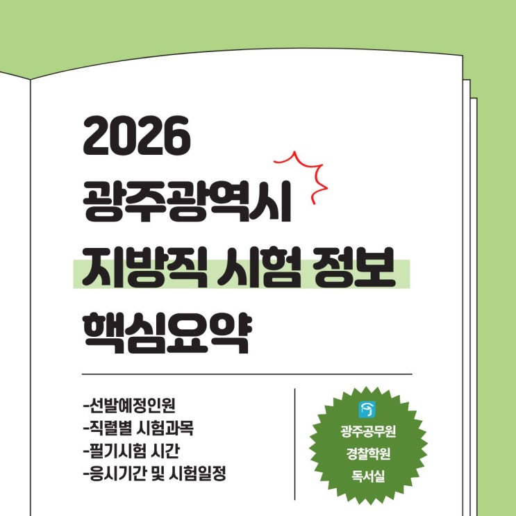 안녕하세요! 전대후문 가성비 관리형독서실 광주공무원경찰학원(독서실)입니다! 오늘은2026년도 제1․2회 광주광역시 지방공무원 임용시험 시행계획을 정리해드리겠습니다! 핵심 부분만 정확하고 빠르게 알아볼까요? 원본 공문 파일도 올려드릴테니 자세한 사항이 궁금하시면 자유롭게 다운로드 하세요! ↓ 선발예정인원 및 시험과목 : 624명 가. 제1회 임용시험 : 615명 ※ 필기시험 과목 중 파란색 글씨는 호남권 공동출제 및 광주광역시 자체출제 과목임(비공개/문제책 회수) 나. 제2회 임용시험 : 9명 ※ 필기시험 과목 중 파란색 글씨는 호남권 공동출제 및 광주광역시 자체출제 과목임(비공개/문제책 회수) ※ 기술계 고졸 경력경쟁임용 필....... <img src="https://blogthumb.pstatic.net/MjAyNjAyMTlfMTAg/MDAxNzcxNDYyMjYzMTY1.RPLHrlZg_vIeFIQ7DiAcSJhqAeJdxZ3CX1g0APuXKm8g.AqT8P6sVslB1z3F2oQmODw71vNkzKZbu5cN41Tf94cEg.JPEG/2.jpg?type=s3" />