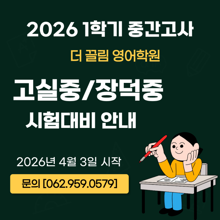 안녕하세요.^^) 광주 영어학원 광산구 영어학원 수완지구 영어학원 신창동 영어학원 운남동 영어학원 더 끌림 영어 학원 수완점입니다. 어느덧 따뜻한 봄기운과 함께 중등부 학생들의 첫 시험, 1학기 중간고사 시즌이 다가오고 있습니다. 저희 학원에서는 완벽한 성적 향상을 위해 4월 3일(금)부터 본격적인 시험 대비에 들어갑니다. [학교별 시험 일정 안내] ※학교마다 시험 날짜가 다르므로 반드시 확인이 필요합니다. 고실중학교 (2, 3학년) 4월 28일(화) ~ 4월 29일(수) 장덕중학교 (2, 3학년) 4월 29일(수) ~ 4월 30일(목) [4월 3일(금) 영어 대비반 개강!] 시험을 약 4주 앞둔 4월 3일 금요일부터 2, 3학년 학생들을 대상으....... <img src="https://blogthumb.pstatic.net/MjAyNjAzMTNfMTEg/MDAxNzczMzgyODMwMzEx.-ndv5l1P11uvlYsQ3_gGSpn6BaeRpezJqvaIsCciW-kg.EXxcTMDqTTlKfpXOb1ab9SWydrGuxn1kLXvOMLPzZCkg.PNG/%C1%A6%B8%F1%C0%BB_%C0%D4%B7%C2%C7%D8%C1%D6%BC%BC%BF%E4..png?type=s3" />