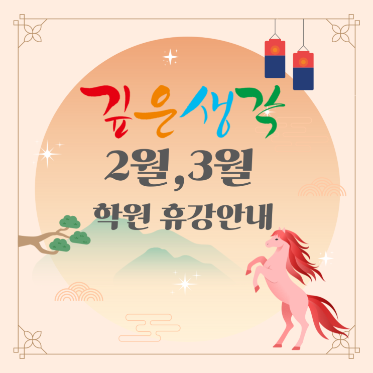 안녕하세요 깊은생각분당 초·중·고등부 휴강일정 안내드립니다❤(●'◡'●)❤ [초·중·고등부 휴강] 일정 2월 16일(월)~2월18일(수) 설날휴강 2월 28일(토)~3월1일(일) 학원휴강 ※ 초·중·고등부는 3월 2일(월)부터 정상 수업 진행합니다. 깊은생각분당학원 초등 · 중등 · 고등 수업 전체 휴강이며, 데스크 또한 운영되지 않으니 수납·문의 등 학원 이용에 참고해주시기 바랍니다. * 2월 , 3월 수강료는 해당 휴강일 수강료에서 제외하고 안내 드릴 예정입니다❤ <<깊은생각분당 카톡으로문의하기, 클릭>> 저를 클릭해주세요! <깊생과 카톡하기> << 깊은생각분당과 이웃하기, 클릭 >> 저를 클릭해주세요....... <img src="https://blogthumb.pstatic.net/MjAyNjAxMjNfMjg4/MDAxNzY5MTQ4NTEzNTE4.ciXZHZupC2W0dAiA9k2x2cX7f_R4QHFmjqcstPoTVmEg.HGuM_u0zSRsT7eyeu0Q0SLqZRRqsuBQxsmCW_InkHtIg.PNG/001.png?type=s3" />