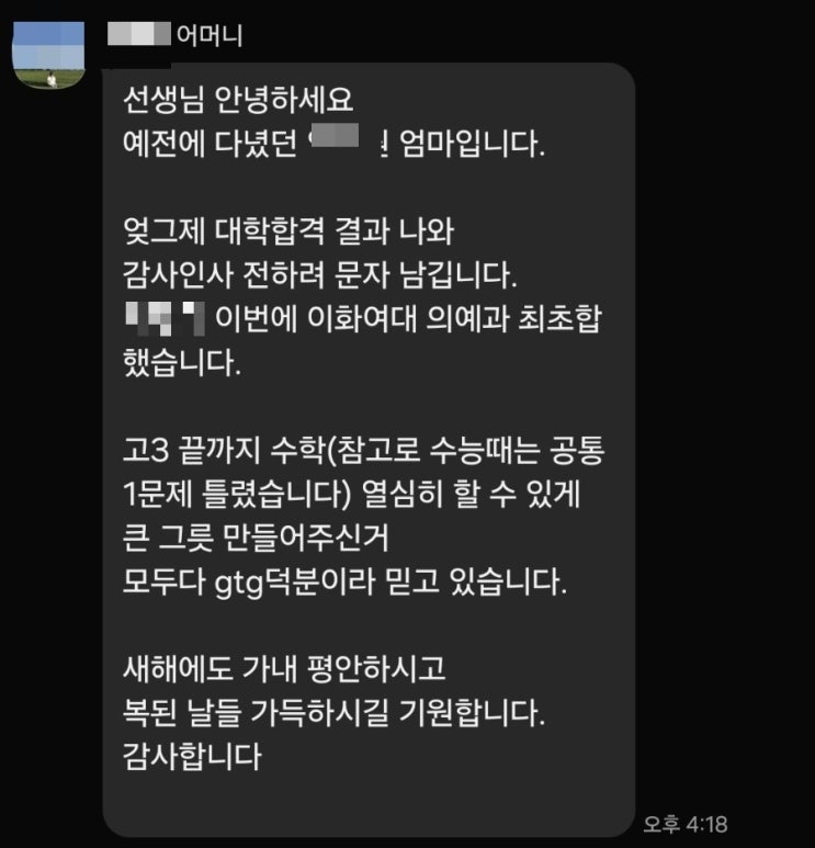 안녕하세요. 아이들과 수학을 즐겁게 탐험하는 GTG 수학입니다. 토요일 수업 중에 카톡이 왔습니다. 수업이 끝나고 확인하니 제자가 이화여대 의예과에 합격했다는 소식입니다. 초등학생일 때 송파에서 분당으로 이사 오면서 저희 GTG 수학에 찾아오셨던 때가 어제 같습니다. 그때부터 중1까지 수강한 학생입니다. 한참 지났는데 잊지 않으시고 기쁜 소식을 전해 주셨습니다. 제자가 좋은 결과를 얻어서 기뻤습니다. 감사합니다. "고3 끝까지 수학 열심히 할 수 있게 큰 그릇 만들어주신 거 모두 다 gtg 덕분이라 믿고 있습니다"라고 하십니다. 저희가 목표로 하는 것이 최종 점수가 아니라 공부할 수 있는 그릇을 만드는 것이었는데 학....... <img src="https://blogthumb.pstatic.net/MjAyNjAxMjZfODAg/MDAxNzY5Mzk5NDkzMTQ4.WGA4L__0LQApbB63XbE07LGWTkUtcaXWmWd39oMFGDQg.jcoj84an8ZiZ6AhQV_uvRJlYCRXvM4yA_cjs6W8hZcYg.JPEG/1769399492139.jpg?type=s3" />