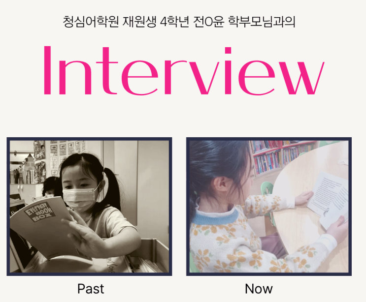 오늘은 전OO어머님의 인터뷰 내용을 소개해 드립니다. 전O윤 학생은 현재 초등학교 4학년생으로 5세때 청심영어유치부에 입학 후에 연계해서 청심어학원 초등부에서까지 7년째 영어를 배우고 있습니다. 전O윤 친구는 꾸준한 영어독서를 통해 매년 영어실력을 쑥쑥 키워오고 있는데요. 책 읽는 걸 좋아하지만 때론 책에 따라서 읽는 걸 좀 지루해 한다거나 시간이 걸리기도 한답니다. 아래 인터뷰 내용을 통해 그럴 땐 어머님께서 어떻게 대처해 주시는지 확인해 보시기 바랍니다! <img src="https://blogthumb.pstatic.net/MjAyNTEyMThfMTMx/MDAxNzY2MDQ3MTAzNjM4.IMhPDGtGDuduFN15v5xyMHeHfMGsPGZ_bCQOr7ySyMwg.ffqmLzQlXCu1MtUt1OQREJR_tXuH6meapwXoJtKPLSMg.PNG/%C1%A6%B8%F1%C0%BB_%C0%D4%B7%C2%C7%D8%C1%D6%BC%BC%BF%E4._%287%29.png?type=s3" />