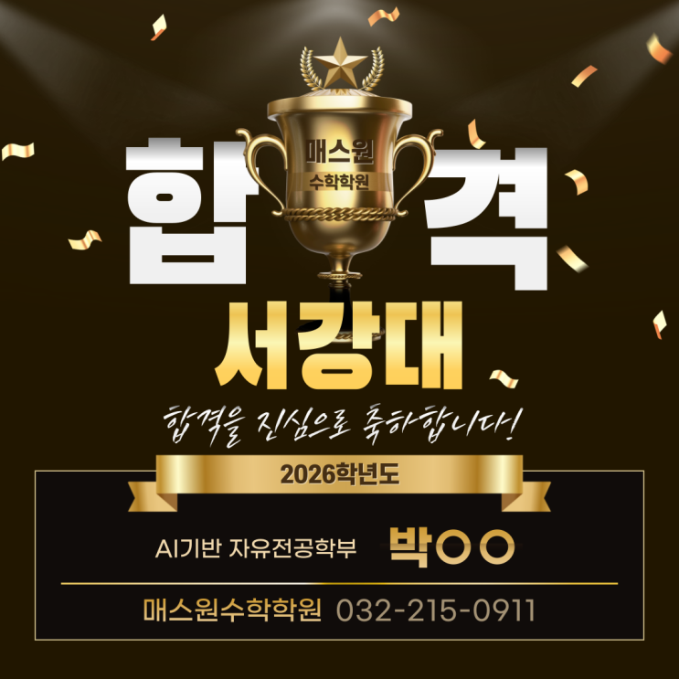#부천수학 #상동수학 #상동역수학학원 안녕하세요, #상동수학 매스원입니다! 2026학년도 대입 서강대 (AI기반 자유전공학부) 합격을 축하합니다. 합격 소식을 알려온 저희 매스원 수학학원 상동고 박OO 학생의 #서강대 합격을 진심으로 축하합니다! 학생의 끈기와 성실함에 더해 #부천수학학원 매스원의 1:1 개별맞춤 수업으로 학생의 약점을 면밀히 분석해 체계적으로 보완하며, 기본 개념부터 고난도 문제 풀이까지 차곡차곡 쌓아온 실력으로 #서강대 AI기반자유전공학부 수시모집에 합격했습니다. 학생 개개인의 수준에 맞추어진 매스원 수학학원만의 체계적인 학습 시스템과 함께라면 원하는 목표, 원하는 대학에 한걸음 더 가까워질 수 있습....... <img src="https://blogthumb.pstatic.net/MjAyNjAxMDRfMTYw/MDAxNzY3NTE3MjA4Mjgy.u194CpVE841PcOh7zV5e6BbCY8h4sA9TCrR9sqh8rVIg.PFpZNaLgbcpaq4Q_EmAWBcXxVp1_1rh99kqA8AIsm4kg.PNG/%BC%AD%B0%AD%B4%EB_%BC%F6%BD%C3_%C7%D5%B0%DD_%BA%CE%C3%B5%BC%F6%C7%D0_%BB%F3%B5%BF%BC%F6%C7%D0_%B8%C5%BD%BA%BF%F8.png?type=s3" />