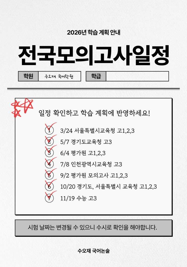 안녕하세요, 부천 수오재 국어학원입니다! 겨울 방학의 끝자락, 이제 곧 새로운 학기가 시작됩니다. 새로운 마음가짐으로 책상 앞에 앉은 우리 학생들을 위해 2026년에 있을 전국 모의고사 일정을 정리해왔습니다 ☺️ 모의고사는 현재 나의 위치를 객관적으로 파익하고 수능까지 마라톤 페이스를 조정하는 중요한 이정표입니다. 올해 시행될 주요 학력평가와 모의평가 일정을 확인하고 개인 스케줄러에 기입해 학습 계획을 세우도록 합시다. 시험 날짜는 시행 기관의 사정에 따라 변경될 수도 있으니 그때 그때 꼭 확인해보세요. 수오재 국어학원은 모의고사 이후 학생들의 상태를 객관화 할 수 있는 분석보고서를 작성합니다. 어디서 실수를 자....... <img src="https://blogthumb.pstatic.net/MjAyNjAyMjRfMTI1/MDAxNzcxOTE0MDc1OTQ1.g-_2xyohzeIgruBbIs8Z0nD6-V4jxI5Stz-wLHd1aPsg.za5v4n4-Zswu5BbyYiiejJD0exo9Ld4J_pUigvv4SPwg.PNG/%C1%A6%B8%F1%C0%BB_%C0%D4%B7%C2%C7%D8%C1%D6%BC%BC%BF%E4..png?type=s3" />