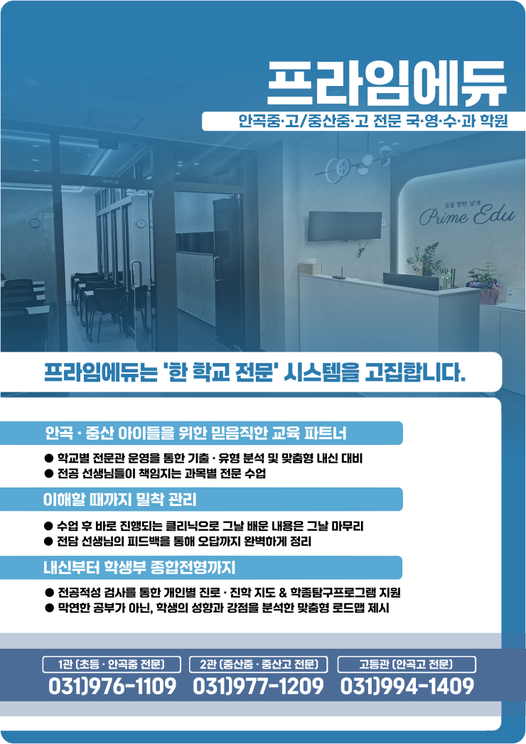 [안곡중·고/중산중·고 전문] 우리 학교를 가장 정확히 아는 학원, 프라임에듀 학교 공부를 도와줄 학원을 찾을 때, 가장 중요한 건 "우리 학교를 얼마나 잘 아느냐"라고 생각합니다. 프라임에듀학원은 안곡중·고/중산중·고를 중심으로 학교별 수업 흐름과 내신, 평가 방식을 분석하여 최적화된 수업을 운영하고 있습니다. 학교별 전용관 운영 : 초등·안곡중(1관) / 중산중·고(2관) / 안곡고(고등관) → 학교에 맞춘 커리큘럼으로 기본이 되는 수업 방향부터 다르게 설계합니다. 국어·영어·수학·과학 각 과목별 담임 직강 & 책임지도 → 담임 선생님이 직접 수업하고, 끝까지 책임 관리합니다. 초·중등 학습 습관 완성 : 수업 후 과....... <img src="https://blogthumb.pstatic.net/MjAyNjAyMjNfMjg5/MDAxNzcxODIwMjgzNDY3.KDJe9HzxUpD2zxw-fKU9M08lDRx9Mn9pmaP5Xs_kvoYg.OT29TDT6h-DQ6IJzEiTX8sV8h4fq0G5luQNqLSpPeBgg.PNG/1.png?type=s3" />