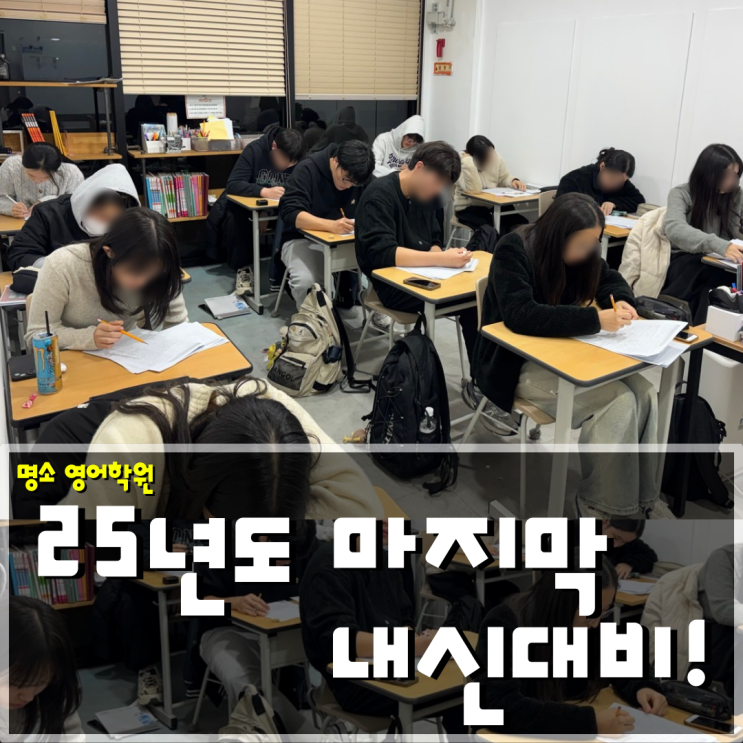 안녕하세요, 명소 영어학원입니다. 기말지필평가가 일주일 앞으로 다가오면서, 우리 학원은 이번 주말에도 1·2학년 학생들의 열정으로 가득했습니다. 3학년은 이미 시험을 마친 상황이지만, 지금은 1·2학년이 최근 마장중의 새롭게 바뀐 시험 스타일에 맞춰 마지막 점검에 돌입하고 있어요. 명소 친구들은 정규 커리큘럼 자체가 탄탄하여 시험 유형이 바뀌어도 핵심 문법·독해·서술형 대비가 이미 몸에 잡혀 있기 때문에 매년 지필평가에서도 눈에 띄는 성과를 꾸준히 내고 있습니다. 이번 시험 역시 기대해볼 수 있을 만큼 집중력이 잘 올라오고 있어요! 이번 내신 대비에서도 지문을 읽고 핵심 포인트를 스스로 정리하는 지문 분석 훈련 실제 시....... <img src="https://blogthumb.pstatic.net/MjAyNTEyMDhfNzgg/MDAxNzY1MTczMDI1ODAx.KtELKU7Sak9ywLSkxUEmJ9fqg_wslFYhNNeXC3KMN9Ug.hH1ob7ZP5GhERO8631F_-agphN9it2rltUz-em1VzZwg.PNG/%C1%A6%B8%F1_%C3%DF%B0%A1_%2812%29.png?type=s3" />