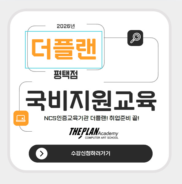 더플랜아카데미 국비지원 수강생 선착순 모집안내! 안녕하세요 ~! 더플랜컴퓨터학원 평택용죽점입니다. 모두 한주 잘 보내시고 계실까요?~ 벌써 12월의 중순이 훌쩍 지나가고 2026년이 다가오고 있네요. 요즘 취업, 이직, 혹은 자격증 준비로 고민하시는 분들이 정말 많지요~! 그렇다면 더플랜과 함께 자격증 준비해보시는걸 추천드립니다! 국비지원으로 자격증 + 실무 스펙 모두 더플랜에서 한번에 완성! 모집대상 취업 혹은 이직을 준비하는 20세 이상 성인 누구나 국비지원교육이란?~ 더플랜컴퓨터학원 국비지원교육은 고용노동부에서 실업자, 구직자, 재직자 모두에게 취업을 위한 훈련비용을 지원하는 제도입니다. 국민내일배....... <img src="https://blogthumb.pstatic.net/MjAyNTEyMTZfMTU2/MDAxNzY1ODg3MjY0NzIw.sc-npJGJnyd6Tun9w6aYUCDisDRivsGcrAx-wTcoenQg.3eOdvpSQiZey0nAHgE6VvLIGac2If17f3DHIia0mtNkg.PNG/image.png?type=s3" />