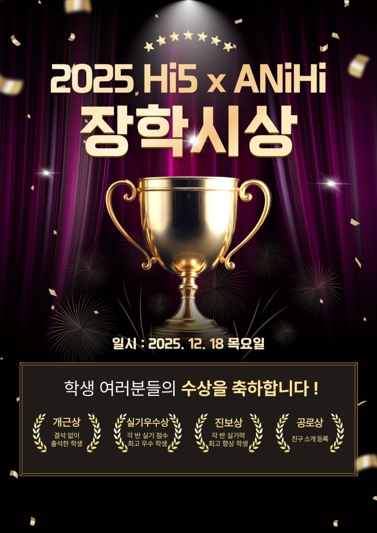 안녕하세요! 구래 하이파이브 미술 학원입니다! 이번 소식은 노력과 성장을 함께 축하하는 시간인 하반기 장학 시상식 소식을 들고 왔습니다 하반기 장학 시상 부문 소개 개근상 한 학기 동안 꾸준히 출석하며 성실한 태도로 수업에 임한 학생들에게 수여되는 상으로 비가 오나 눈이 오나, 컨디션이 좋지 않은 날에도 학원에 나와 자신의 자리를 지켜온 학생들의 책임감과 성실함이 돋보였습니다. 실기 우수상 공모전, 실기대회 등 좋은 성과를 거두어 자신의 실력을 증명한 학생들에게 주어지는 상으로 수업 시간 외에도 끊임없이 고민하고 도전한 결과가 값진 성과로 이어졌음을 다 함께 축하하는 시간이었습니다. 진....... <img src="https://blogthumb.pstatic.net/MjAyNTEyMjdfNjUg/MDAxNzY2ODEyODUxNDI3.NlFBM1C2jMau0rRsQjJM11wRzs3G1kiWU41eyBmYVOYg.HqgYTNXMCWDkVn5rASGJf1oz73D3qzt8qbpacU9CTUMg.JPEG/%C0%E5%C7%D0%BD%C3%BB%F3_%C6%F7%BD%BA%C5%CD.jpg?type=s3" />