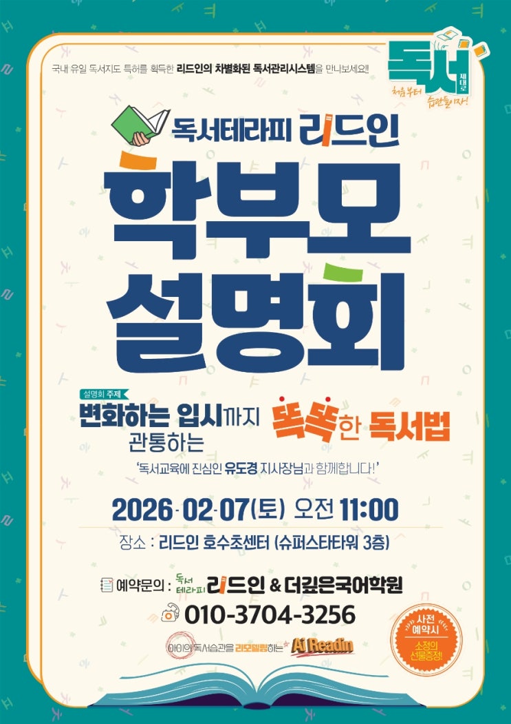 구래동 리드인더깊은 국어학원 학부모 설명회를 마치며… 진심으로 감사드립니다 안녕하세요. 구래동 리드인더깊은 국어학원 원장입니다. 얼마 전 진행된 학부모 설명회에 귀한 시간을 내어 참석해주신 모든 학부모님들께 깊은 감사의 인사를 전합니다. 설명회를 준비하며 ‘과연 저의 진심이 잘 전달될 수 있을까’ 하는 마음으로 여러 번 자료를 정리하고 또 정리했습니다. 단순한 학원 소개가 아닌, 우리 아이들의 국어 학습 방향에 대해 함께 고민하고 공감하는 시간이 되기를 바랐기 때문입니다. 설명회 당일, 진지하게 경청해주시고 고개를 끄덕이며 공감해주시던 모습, 끝까지 남아 질문을 해주시던 모습에서 학부모님들의 깊은 관심과 진....... <img src="https://blogthumb.pstatic.net/MjAyNjAyMjNfMTMx/MDAxNzcxODM5MTE3ODUw.Nvh4rms6RaYGfOKk8-dqMRgUMyfa7PQ2Tx4T6IvzT-Ig.9cKsVwIZVUIryLEiv61hwHC87RxmjXIpva2wyu_InYcg.JPEG/900%A3%DF1771838935513.jpg?type=s3" />