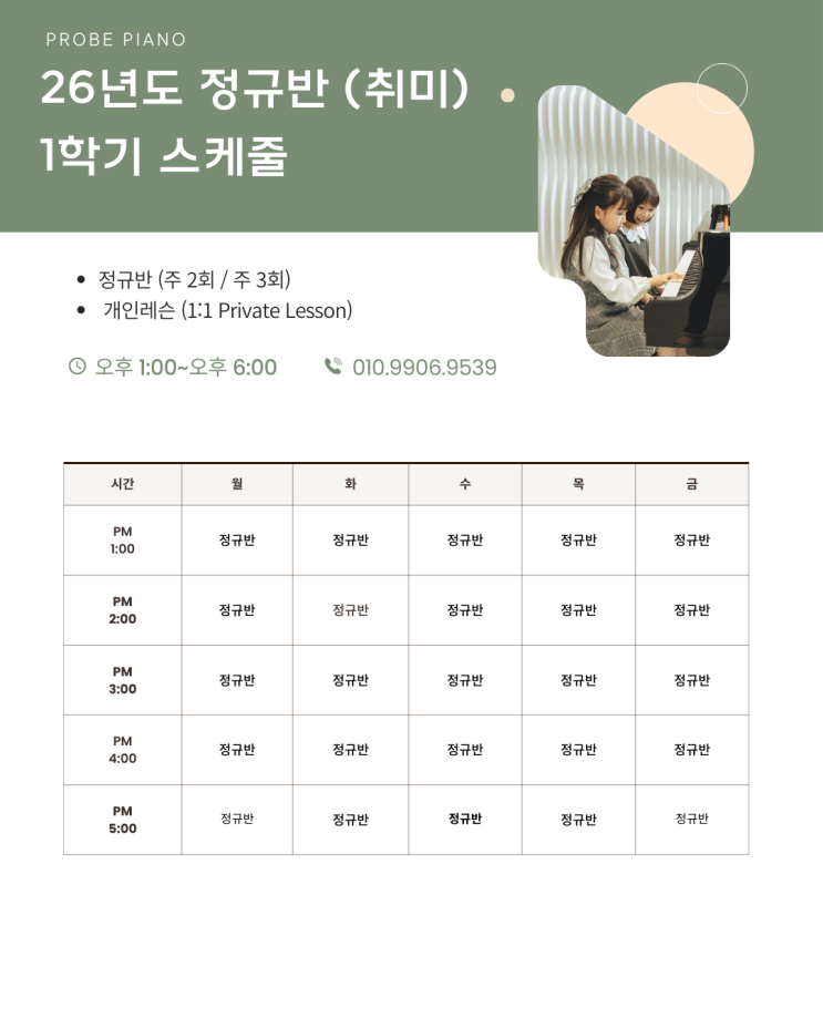 삼일절 휴원 안내 & 26년도 정규반 1학기 스케줄 안내 안녕하세요, 프로비 피아노(PROBE PIANO) 입니다 3월을 맞이하며 학부모님들께 중요한 일정 안내드립니다. 2026년도 정규반(취미) 1학기 스케줄 안내 ✔ 수업 형태 정규반 (주 2회 / 주 3회) 개인레슨 (1:1 Private Lesson) ✔ 운영 시간 오후 1:00 ~ 오후 6:00 문의 : 010-9906-9539 삼일절 휴원 안내 ✔ 3월 1일 (일) — 삼일절 휴무 ✔ 3월 2일 (월) — 대체공휴일 휴무 ✔ 3월 3일 (화) — 정상 등원 ※ 대체공휴일로 인한 보강수업은 진행되지 않습니다. 수업 일정 참고 부탁드립니다. <img src="https://blogthumb.pstatic.net/MjAyNjAyMjNfMjM3/MDAxNzcxODIwNjAzNDM0.K9a3YKZejsKCpkdWTI0rJW3LXFXSWaRvg4qu4zP5oFAg.2ll_UD1yr6AY9j7oWtTY9BTqLM7UX4Miy4idqG4WM3gg.PNG/%C3%CA%B5%EE_%C1%A4%B1%D4%B9%DD_%BD%C3%B0%A3%C7%A5.png?type=s3" />