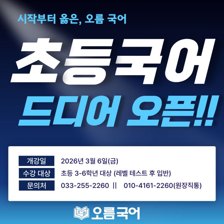 안녕하세요. [오름국어수학학원]입니다. 초등 국어 수업 첫 개강을 맞아, 1. 초등 국어 개강 안내 2. 초등부터 왜 국어 공부를 시작해야하는지 에 대해 안내드리려 합니다.^^ 오름국어 "초등 국어" 개강 안내 국어는 나중에 해도 될까요? 고등 국어에서 무너지는 이유는 생각보다 훨씬 앞에 있습니다. 초등 국어 수업은 초등 → 중등 → 고등까지 이어지는 문해력 구조로 설계되었습니다. - 수업 방식 * 지문 기반 정독 훈련 * 문장 구조·어휘 이해 수업 * 말하기·쓰기 연계 사고 정리 * 개별 이해도 체크 및 피드백 ‘많이 푸는 국어’가 아니라 제대로 읽는 국어를 목표로 합니다. - 수업 시간표 요일 : 화요일 / 금요일 (....... <img src="https://blogthumb.pstatic.net/MjAyNjAyMDlfNzUg/MDAxNzcwNjQ3NjU2MDYy.MgQ-RuBMd-4HPIecwWk--oC9mJlFfvc81QupyQtb7ZMg.Uig6X4o1gWFihPz_pS1Q_tPpH9gijcWB1w3boeuLXP8g.PNG/1-%C3%CA%B5%EE%B1%B9%BE%EE.png?type=s3" />