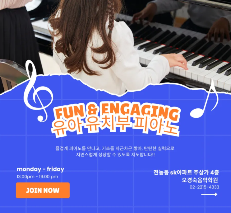 등록번호제 707 유아·유치부 피아노, “재미있게 시작해서 기초를 탄탄하게” “아이가 피아노를 좋아할까요?” “처음부터 너무 어렵게 하면 금방 싫증 내지 않을까요?” 유아·유치부 시기의 피아노는 **실력보다 ‘좋은 첫 경험’**이 훨씬 중요합니다.✨ 그래서 저희는 아이들이 피아노를 즐겁게 시작하고, 그 즐거움이 탄탄한 기초 실력으로 이어지도록 수업을 진행합니다. 1) 피아노는 ‘재미’가 먼저예요 유아·유치부 아이들은 집중 시간이 짧고, 감정에 따라 학습 몰입도가 크게 달라요. 그래서 수업에서 가장 먼저 잡는 것은 **“피아노 = 즐거운 시간”**이라는 인식입니다. 짧고 명확한 목표로 “성공 경....... <img src="https://blogthumb.pstatic.net/MjAyNjAyMThfMTQ5/MDAxNzcxMzk5NDk2NjQy.pDzXquILCazr_enCcg7D1DGZ9g9lg7zm_LaoFeTMBfsg.Alg6V4cGc2J-wRRMcdJFXSgIdXQpIUkB86zZP7bCYCsg.PNG/900%A3%DF1771397130025.png?type=s3" />