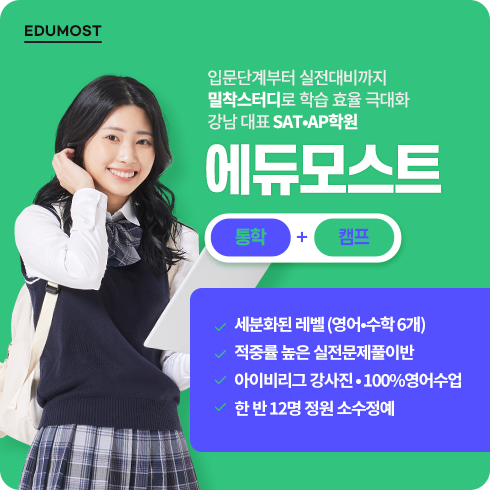 안녕하세요. 만점 배출 SAT학원 에듀모스트입니다. SAT 여름특강 통학형 프로그램에 이어 20차 관리형 SAT캠프를 안내해 드리겠습니다. SAT캠프는 해외나 지방에 거주하여 통학이 어려운 학생들을 위한 프로그램으로 주로 교포, 주재원 자녀, 외국인 학생들이 참여하며 철저한 관리를 위해 20명만 모집하여 4주 / 6주 프로그램으로 운영하고 있습니다. ※ 수업은 에듀모스트 대치 본원에서 통학형 학생들과 함께 진행되며 한 반 최대 12명 정원으로 종합반 6개, 실전반 2개 레벨로 운영됩니다. 2026 에듀모스트 SAT 여름캠프 (20차) - 국내캠프 14회, 미국 보스톤 캠프 5회 진행 경험 - 에듀모스트 임직원 호텔 상주, 밀착 관리 에듀모스트 SAT 캠....... <img src="https://blogthumb.pstatic.net/MjAyNjAyMjRfOTgg/MDAxNzcxOTEzMzgyMzc5.pmrl20M6N_3hmx0eiU5E0zNpQMGpiTSthmwLhhVNF34g.ymUyuXqbirhCr0fcvvbwF7dWf348ykMMs5t5Ya65JRgg.PNG/popup_02.png?type=s3" />