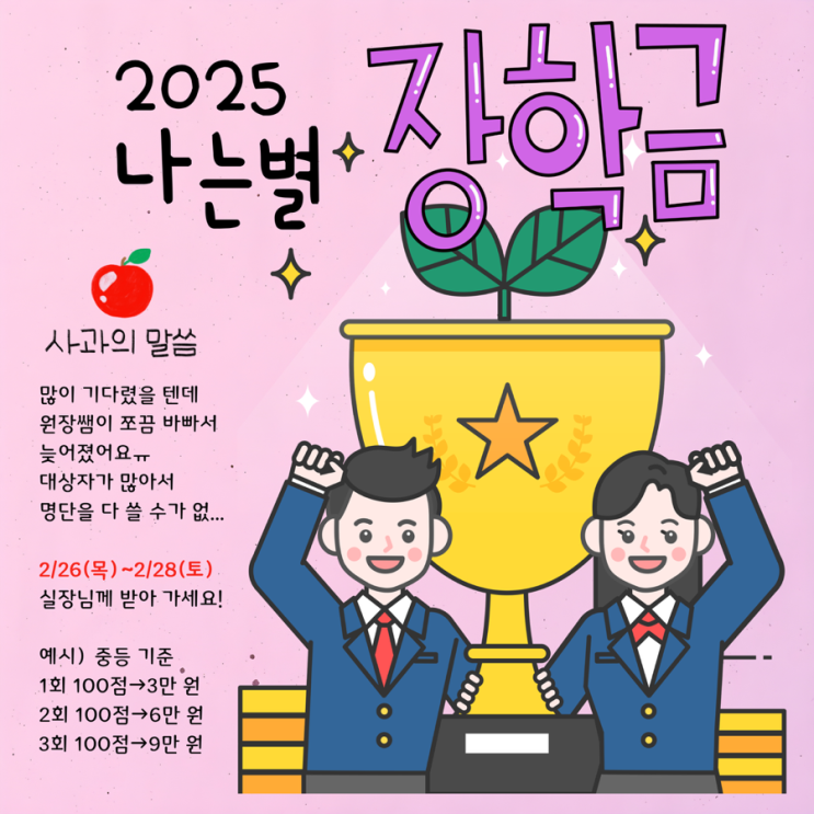 안녕하세요~ 나는별 학원입니다! 우리 나는별 원생들, 2025년 한 해도 정말 열심히 공부했는데요. 열심히 공부한 만큼 칭찬도 듬뿍 해줘야겠죠? 나는별 학원은 매 학기 중간고사, 기말고사를 치른 원생들을 대상으로 장학금을 지급해 왔어요✉️ 자 그렇다면, 어떻게 하면 장학금을 받을 수 있는 것인가~~~~~ 크게 '성적 우수'와 '성적 향상' 두 가지가 있습니다. 나는별 장학금 기준 중등 성적 우수(전교 5등 이내)➡️ 10만 원 성적 우수(과목 만점)➡️ 3만 원 성적 향상(20점 이상)➡️ 2만 원 ✨고등✨ 성적 우수(전교 5등 이내)➡️ 15만 원 성적 우수(과목 만점 or 1등급)➡️ 5만 원 성적 향상(20점 이상 or....... <img src="https://blogthumb.pstatic.net/MjAyNjAyMjdfMzIg/MDAxNzcyMTc0NDE4OTMy.CQMAzf4F9pJr6x_7xTS034hwe8wNoGGUXrvq6i5wCUkg.SmgPLJ40t_Lz1HqRsHtIT3YBU2T-dhF6gVKXkieHCUog.PNG/IMG%A3%DF8377.PNG?type=s3" />