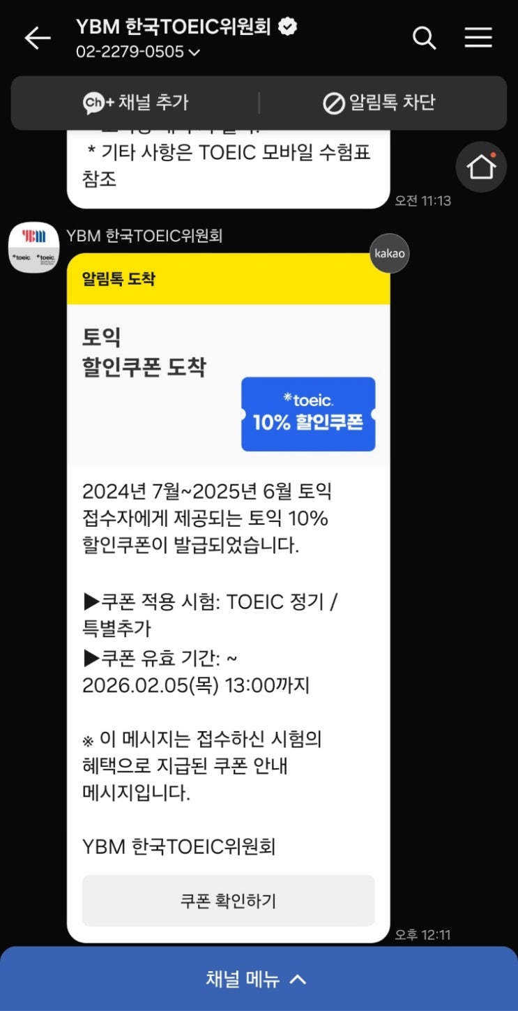 오늘 갑자기 YBM에서 카톡이 하나 딱~!!!! 오더라구요.. 뭐지?? 하고 봤더니... 작년부터인가?? 갑자기 가끔 이렇게 할인쿠폰을 뿌리더라구요.. 가격을 인상해놓고 나서 쿠폰을?? 그냥 가격을 내리는 게.... ㅡㅡ;;; 일단 접수를 해봤습니다. 10퍼센트인 5250원 할인이구요 무조건 다 되는 게 아니라 해당 시험이 있더라구요 1/11, 1/25, 2/1, 2/8 이렇게 4개의 시험만 해당되는 듯 합니다. 1월25일이나 2월8일에 오랜만에 토익을 보려고 했는데 타이밍은 좋은 듯 합니다 ㅎ 접수할 때에.. 쿠폰 누르면 적용 됩니다. 그리고 나서 둘러보니.. 다른 할인권도 있네요??? 이건 언제 들어온 거지? mos 할인권?? 암튼... 저랑은 상관이 없는거라.. 여러....... <img src="https://blogthumb.pstatic.net/MjAyNTEyMzBfMjA2/MDAxNzY3MDY4ODA3NTgw.xqWyAGzXhlLhJlO7fq7R4lOYY7n2QVl098vK67AlfQwg.HUbFvGO2P-SVpNbBYFGrT-8KmGgJRARpX7j5GBkv90sg.JPEG/KakaoTalk_20251230_132504949.jpg?type=s3" />