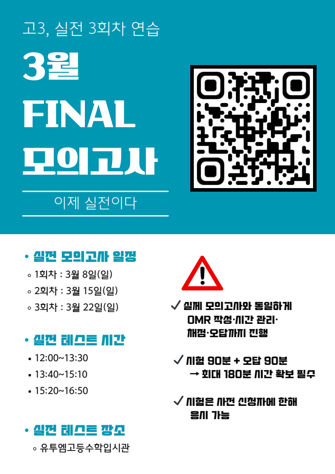 안녕하세요. 익산 유투엠 수학학원입니다. 입춘이 지나고 어느덧 26학년도 첫 모의고사가 한 달 앞으로 다가왔습니다. 우리 고3 학생들에게는 "3월 모의고사는 단순한 시험 그 이상의 의미를 갖죠" 겨울방학 동안 갈고닦은 학습 방향을 검증하고, '대입의 기준점을 세우는 첫 번째 관문'이기 때문이에요. 하지만 실력만큼 중요한 것이 바로 '실전력' 입니다. 많은 아이들을 지켜보면 특히 3월 모의고사 때에는 긴장감에 휩싸여 아는 문제도 놓치는 안타까운 상황이 반복되곤 합니다. 자칫 절망에 빠지기 쉬운 시험이기 때문에 익산 유투엠은 우리 아이들이 실전이라는 벽 앞에서 무너지지 않도록, 매년 [3월 파이....... <img src="https://blogthumb.pstatic.net/MjAyNjAyMjNfMjM0/MDAxNzcxODI5MzEyNDc1.BHO9Ju2pH2YkG6VsI8RbRm67E7H4kbrR9fTledm_820g.xPzPlq6IYcHz8c7IH2rNXYXSL1djomGjebY3n_pwgxQg.PNG/image.png?type=s3" />