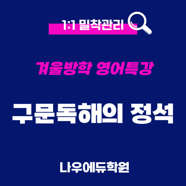 감(Feeling)으로 찍는 영어는 그만! 보이는 논리(Logic)로 1등급 완성! 안녕하세요, 나우에듀학원입니다. 겨울방학은 우리 아이들의 영어 실력, 그중에서도 '독해 속도'와 '정확도'를 결정짓는 구문(Syntax) 실력을 키울 수 있는 골든타임입니다. 단어는 열심히 외우는데, 막상 문장이 길어지면 주어와 동사를 못 찾아서 헤매는 학생들이 많습니다. 이번 겨울방학, 나우에듀학원에서 [구문 독해의 정석] 특강을 통해 영어 문장을 보는 눈을 확실하게 바꿔드리겠습니다! 2026 겨울방학 [구문 독해의 정석] 특강 안내 1. 이런 학생들에게 강력 추천합니다! ♀️♂️ 문법 용어는 들어봤지만, 막상 긴 문장은....... <img src="https://blogthumb.pstatic.net/MjAyNTEyMjRfMjA3/MDAxNzY2NTcxMjc1ODE2.lQWX2Cj4k6NvwQAO1qeoOM9RQyuf5r2bCF2AlcsQn5Ig.gJPvAzX66Ca_vSFv2LgXR-qZmzOwuPqJv4scy_iE76sg.PNG/%BD%E6%B3%D7%C0%CF-004_%281%29.png?type=s3" />