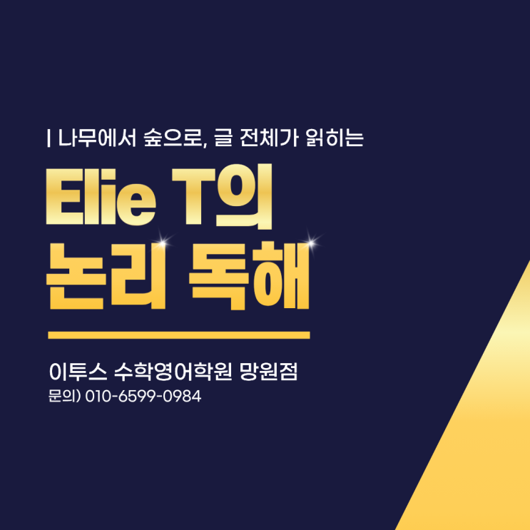 안녕하세요. 이투스수학영어학원 망원점 영어강사 Ellie입니다. 요즘 학부모님들과 상담을 하다 보면 이런 말씀을 정말 자주 “영어도 문제지만, 국어가 더 발목을 잡는 것 같아요.” “국어는 공부를 해도 성적이 잘 안 오르네요.” 실제로 최근 수능에서 국어는 점점 더 어려워지고 있고, 이제는 “국어 때문에 대학이 갈린다”는 말이 전혀 과장이 아닙니다. 그런데 아이러니하게도 영어와 국어가 동시에 안 되는 학생들에게는 공통적인 문제가 있습니다. 어휘가 부족해서도, 문법을 몰라서도 아닙니다. 바로! 문장 구조를 못 잡고, 글의 논리 구조를 읽지 못한다는 점입니다. 수업을 하다 보면 학생들이 독해 지문을 이렇게 읽는 경우가 많습....... <img src="https://blogthumb.pstatic.net/MjAyNTEyMjZfMjAz/MDAxNzY2NzM2MDcwODI0.yEzk1a6lYNpjRwKhIBd-kFzLBNjKzu2pCqsq14SP6XYg.2U4Flfg7PTjhhaIV2qy9aTgAUzYtmMNsLfTcSvZbzhIg.PNG/1.png?type=s3" />