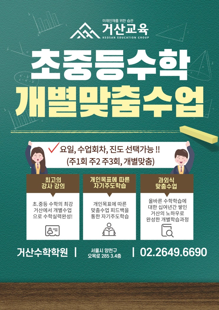 초·중등 수학, 이제는 개별맞춤이 기본입니다. 거산수학학원 개별맞춤 수업 같은 교재, 같은 진도 수업은 이제 그만. 아이마다 다른 실력과 목표에 맞춰 요일 · 수업 횟수 · 진도까지 선택 가능한 맞춤 수업을 진행합니다. ✔ 주 1회 / 주 2회 / 주 3회 선택 가능 ✔ 개별 진도 설계 ✔ 개인 목표 기반 학습 관리 <img src="https://blogthumb.pstatic.net/MjAyNjAyMjRfMTE1/MDAxNzcxOTIzMTg4MjMy.WbQ-ASRnCaCPzY0hlJj-NpeD-V7AkUBv03unUvfuLC4g.vKBSlv50_SzOZxsPg_6YLhtIttyfoveGwoPsyaByvWcg.JPEG/%C3%CA%C1%DF%B5%EE%B0%B3%BA%B0%BC%F6%BE%F7.jpg?type=s3" />