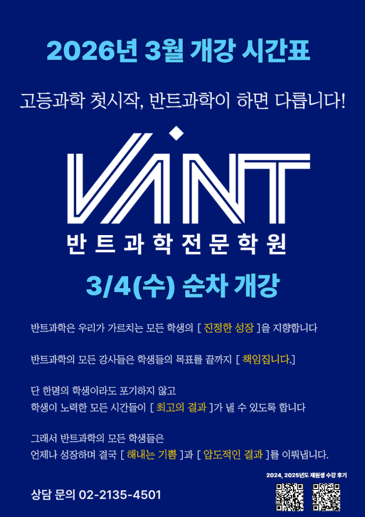 [V A N T]3월 새학기 개강 안내 ▣ 3/4(수) 순차적 개강 ▣ 최상위 과학의 모든 것!! 3월 선택은 1년의 성적을 결정합니다. 매년 증명되는 반트과학의 최상위권 배출은 1년동안 꾸준히 커리큘럼을 완주한 학생들이였습니다. 학생들이 끝까지 신뢰하고 1등급을 결과로 만들어 내는 곳, 바로 반트과학입니다. ▼수업 신청 방법( 010-2075-4501 문자전송) [이름/ 학교 / 수강과목] < 고1 > ■ 하이브리드 통합과학 ▶ 강서고 - 토 10:00~1:00 (3/7 개강) ▶ 양정고 - 일 10:00~1:00 (3/8 개강) ▶ 대일고 - 일 10:00~1:00 (3/8 개강) ▶ 진명여고 - 토 10:00~1:00 (3/7 개강) ▶ 한가람고 - 토 10:00~1:00 (3/7 개강) ▶ 신목고 - 토 10:00~1:....... <img src="https://blogthumb.pstatic.net/MjAyNjAyMjVfMjI0/MDAxNzcxOTQ3MTAxNjE3.zUFLAYO8sfgG8aMbUKq8loWfFnjMfDybDdPeWeKbmpkg.Ty5Cydxs7nnkb8Jnjx19vTSXR7OMZkmQMDkkNHHWa1gg.PNG/2026_3%BF%F9_%B0%CB%B4%DC%BD%C3%B0%A3%C7%A5_%282%29.png?type=s3" />
