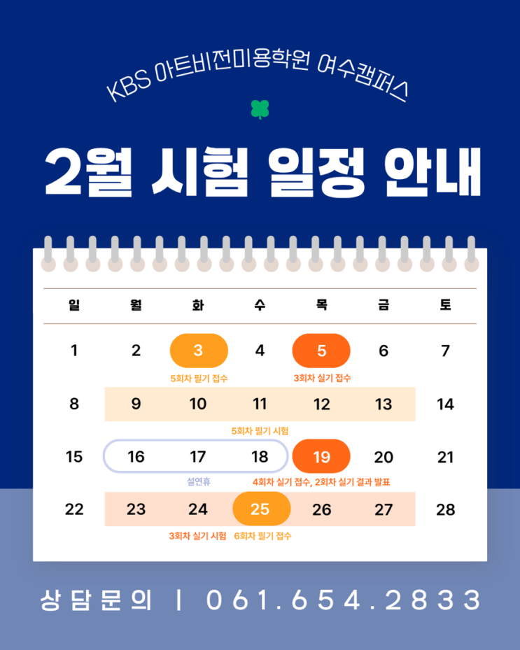 c여수미용학원 여수국비미용학원 KBS아트비전미용학원 "2월 미용 국가자격증 시험 일정 총정리 ✏️"
