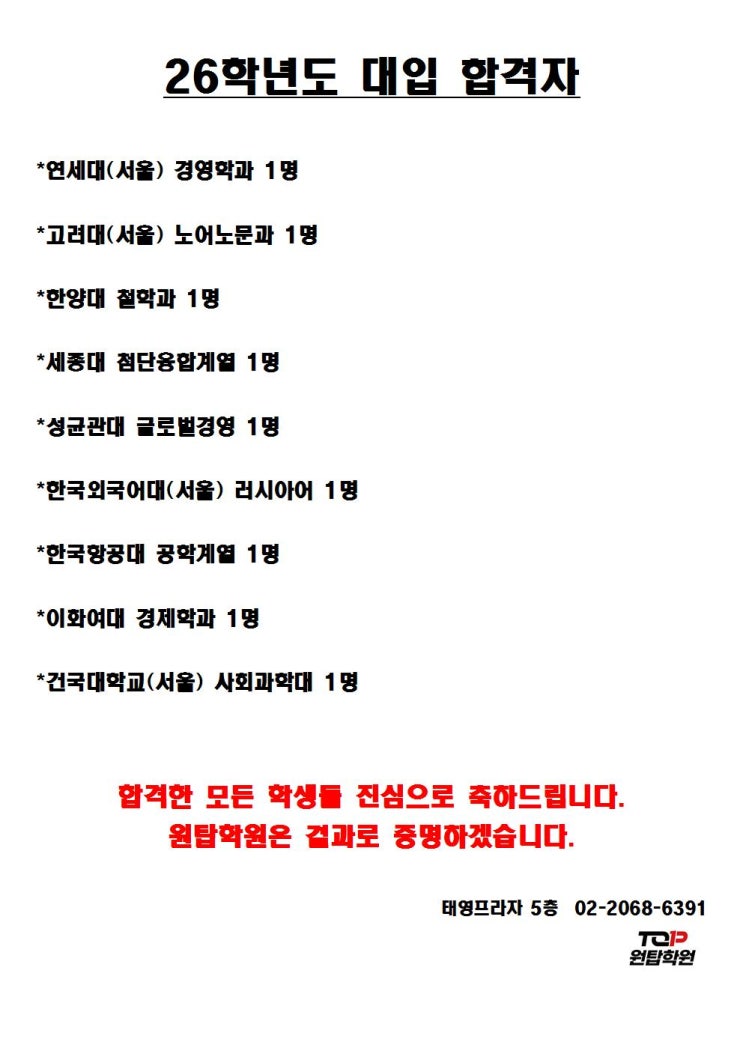 안녕하세요 원탑학원입니다. 학부모님들과 학생여러분이 열심히 공부한 결과를 이렇게 올립니다. 그동안 수고 많았습니다. 멋진 미래를 꿈꾸는 대한민국의 멋진 청년으로 성장하시길 바라겠습니다. <img src="https://blogthumb.pstatic.net/MjAyNjAyMjBfMTUg/MDAxNzcxNTY3NTA3ODY3.7nAbzfdIpqqvZeJUGyUbahVUfoph8kSsruii5heQF2Ag.y2K04xfz4bXQ1qJgoVE9H6ZVSpzml8D8wtQ9l3V3lngg.JPEG/%BF%F8%C5%BE%C7%D0%BF%F8_%B4%EB%C0%D4%C7%D0%B0%DD%C0%DA_%B1%D7%B8%B2001.jpg?type=s3" />