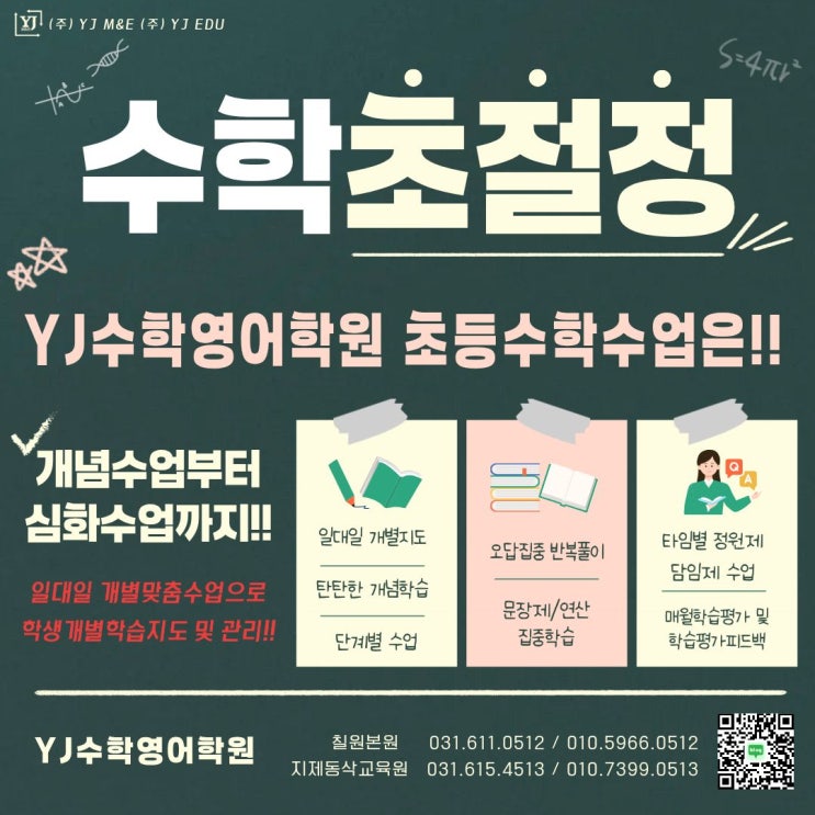 #칠원동영수학원 #동삭동영수학원 수학영어과학전문 YJ수학영어학원입니다. 새 학기가 시작된지가 벌써 3주차가 지났습니다. 새 학년, 새로운 반에서의 적응도 어느정도 되면서 현 학년의 공부에 힘을 기울려야할 시기입니다. 3월 초에 각 학교에서 기초학력평가를 실시하면서 작년 학습에 대한 평가도 실시되었습니다. 우리 YJ수학영어학원 학생들도 모두 거뜬하게 기초학력평가도 쉽게 잘 보았다고들하네요^^ 수학과목은 다른과목보다도 더 전 학년의 학습이 잘 되어있어야하는 단계별 누적과목입니다. 현 학년의 학습이 잘 이루어지기 위해서는 전 학년의 학습이 잘 되어있어야합니다. YJ수학영어학원의 수학수업은 무조건~ 진도만 나가는 수....... <img src="https://blogthumb.pstatic.net/MjAyNjAzMTVfMTc5/MDAxNzczNTU1NzA4MDEy.J8YCamwNiE-F48uRaSoMiOaKs7YdD7PhhRYSSbthhCsg.HP8HgY4bPRdxWJynqvt0Dvb6uK2PZ7n4l5Kd8hyPf-Ag.JPEG/%C1%A6%B8%F1%C0%BB_%C0%D4%B7%C2%C7%D8%C1%D6%BC%BC%BF%E4._%2826%29.jpg?type=s3" />