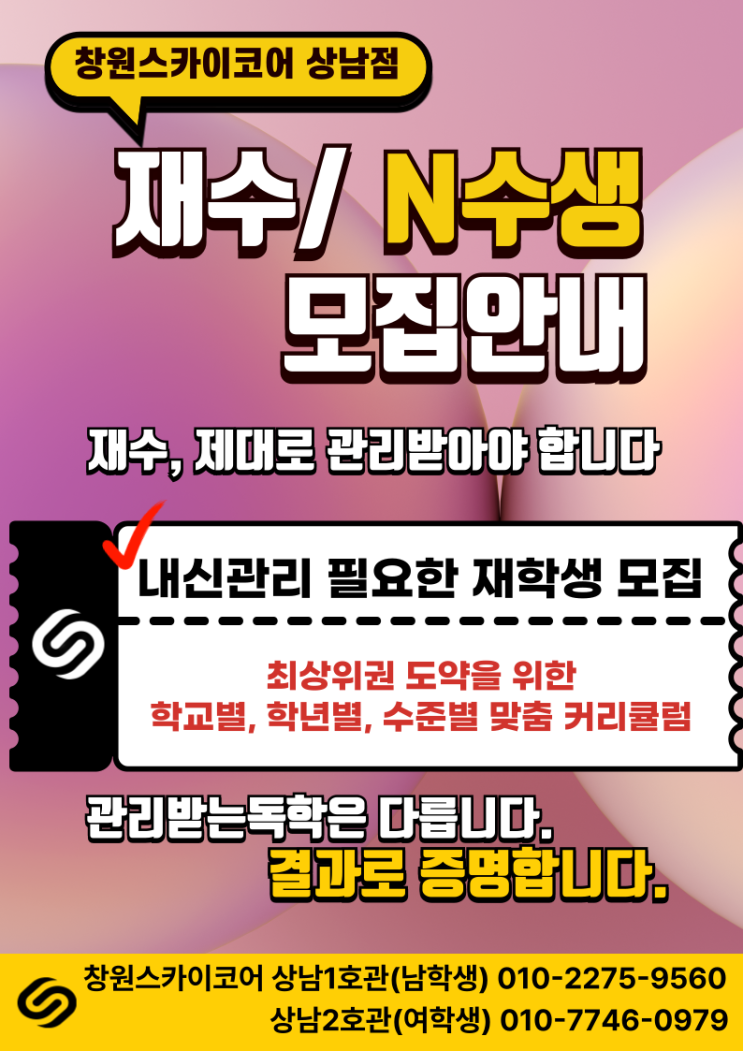 상남동독서실 재수생, 왜 독학이 힘들까요? 관리가 필요한 이유 공부를 다시 시작한 재수생, N수생 학부모님들께서 가장 많이 하시는 말씀이 있습니다. “이번에는 혼자 해보겠다고 하는데… 괜찮을까요?” “독서실은 다니는데 성적이 그대로예요…” 처음에는 의지가 분명합니다. 하지만 시간이 지날수록 흐트러지는 모습, 혹시 이미 느끼고 계시지 않으신가요? 재수, N수는 단순히 ‘시간을 많이 확보하는 것’으로 해결되지 않습니다. 오히려 더 중요한 건 그 시간을 어떻게 쓰느냐입니다. 많은 학생들이 독학을 시작하지만 결국 어려움을 겪는 이유는 분명합니다. 공부 방향이 맞는지 모른 채 문제만 반복하고, 하루 루틴이 무너지면서 학습....... <img src="https://blogthumb.pstatic.net/MjAyNjAzMThfMTgz/MDAxNzczODE5ODI3MTg4.oerS5HjUWGz6vPfMdiKN8VxZrv5BsSvImWXp3B6hFvAg.5C8KwjHH6-JwacXb06LOOASNchf5DkYKzSLXg0rIYnIg.PNG/001.png?type=s3" />