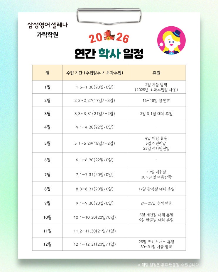 [가락동]삼성영어 셀레나 가락학원 2026 연간 학사일정 및 월별 학습일정